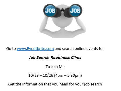 Also, remember to join me for my Job Search Readiness Clinics beginning Friday, October 23 and ending Monday, October 26, from 4 pm – 5:30 pm each day. I will share with you valuable information that you can use to kick off your successful job search with a bang.