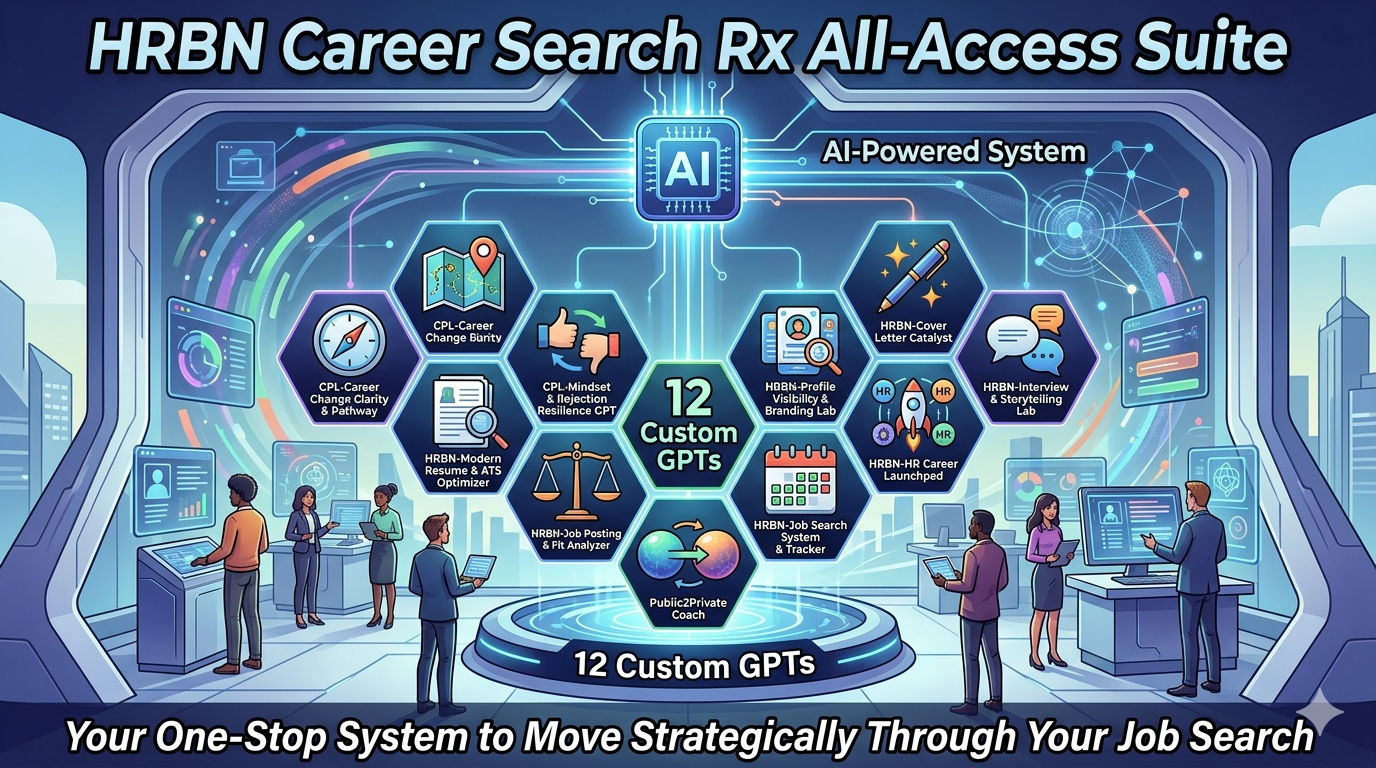 The HRBN-Career Search Rx All-Access Suite includes support specifically designed for people making this transition. From career clarity and repositioning to résumé translation, fit analysis, interview prep, and offer strategy, the suite can help public-sector professionals move through the pivot with more structure and less confusion.