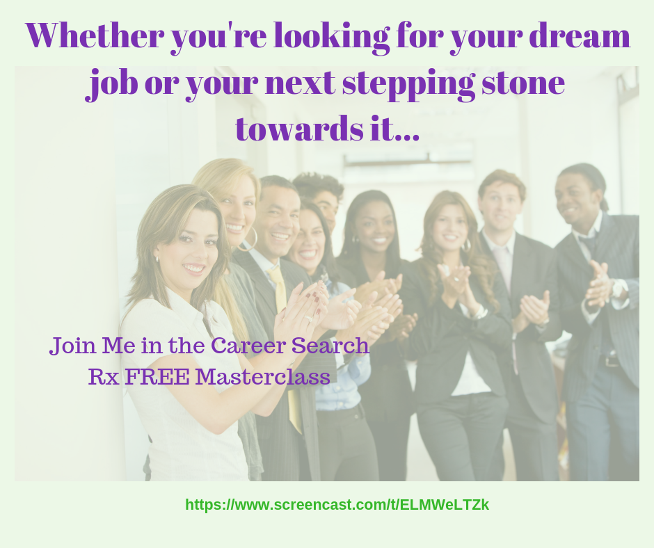For even more detailed information on how to launch a successful career search and live your best career live, view my free Career Search Rx Masterclass videos which consist of five videos full of career content that you can use. Access video #1 at https://www.screencast.com/t/ELMWeLTZk.