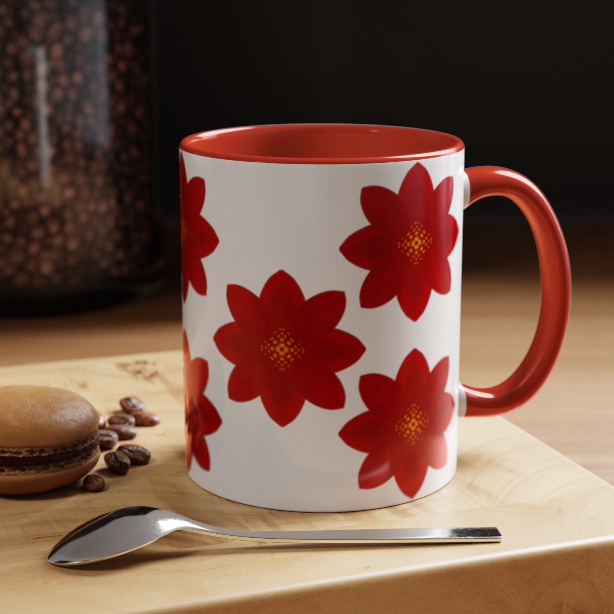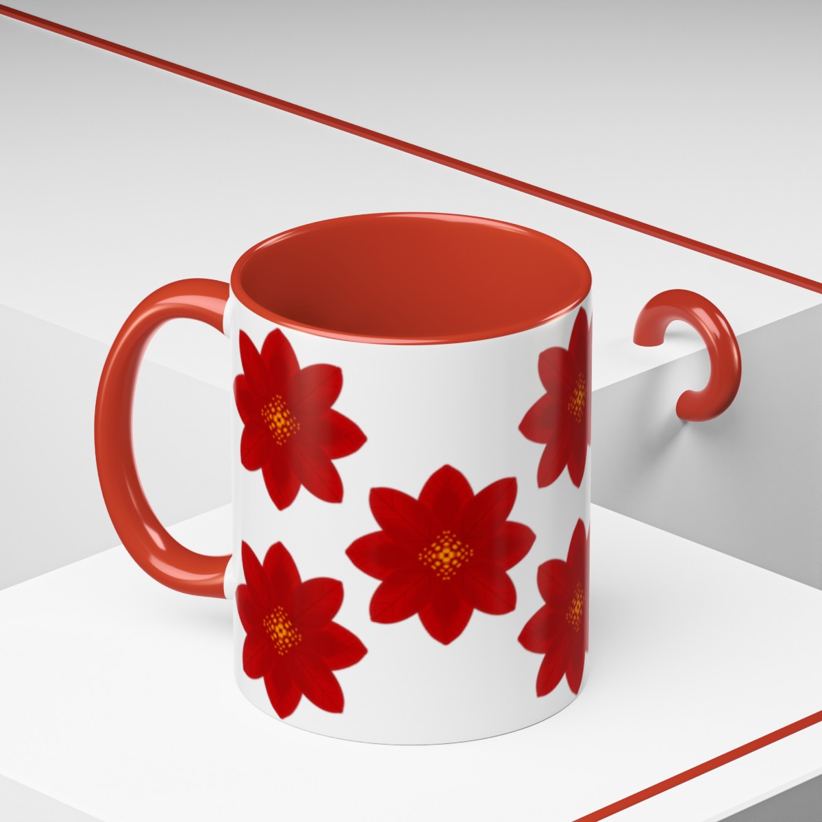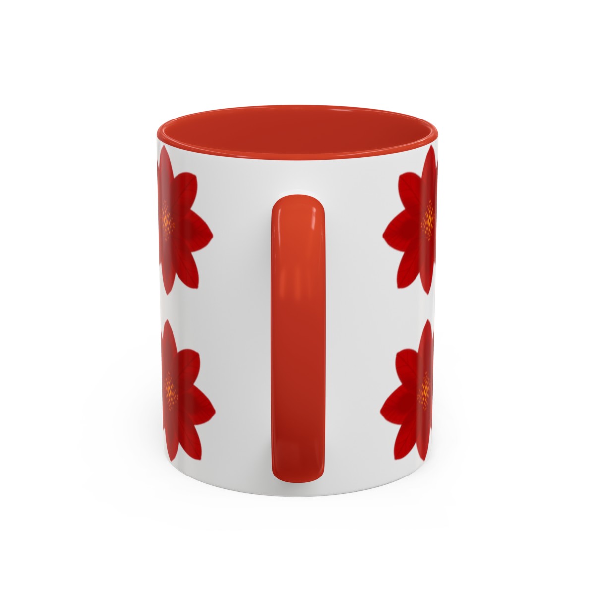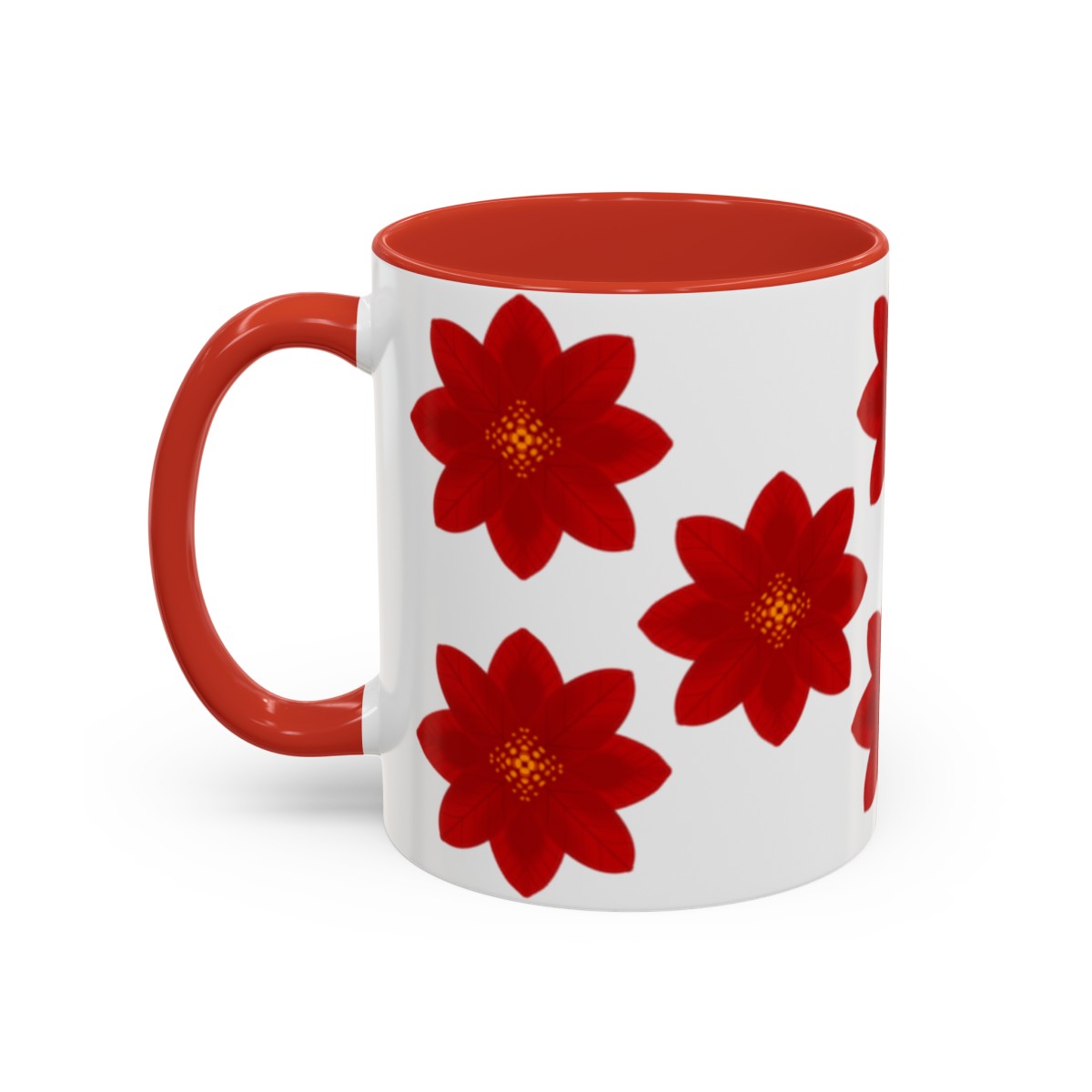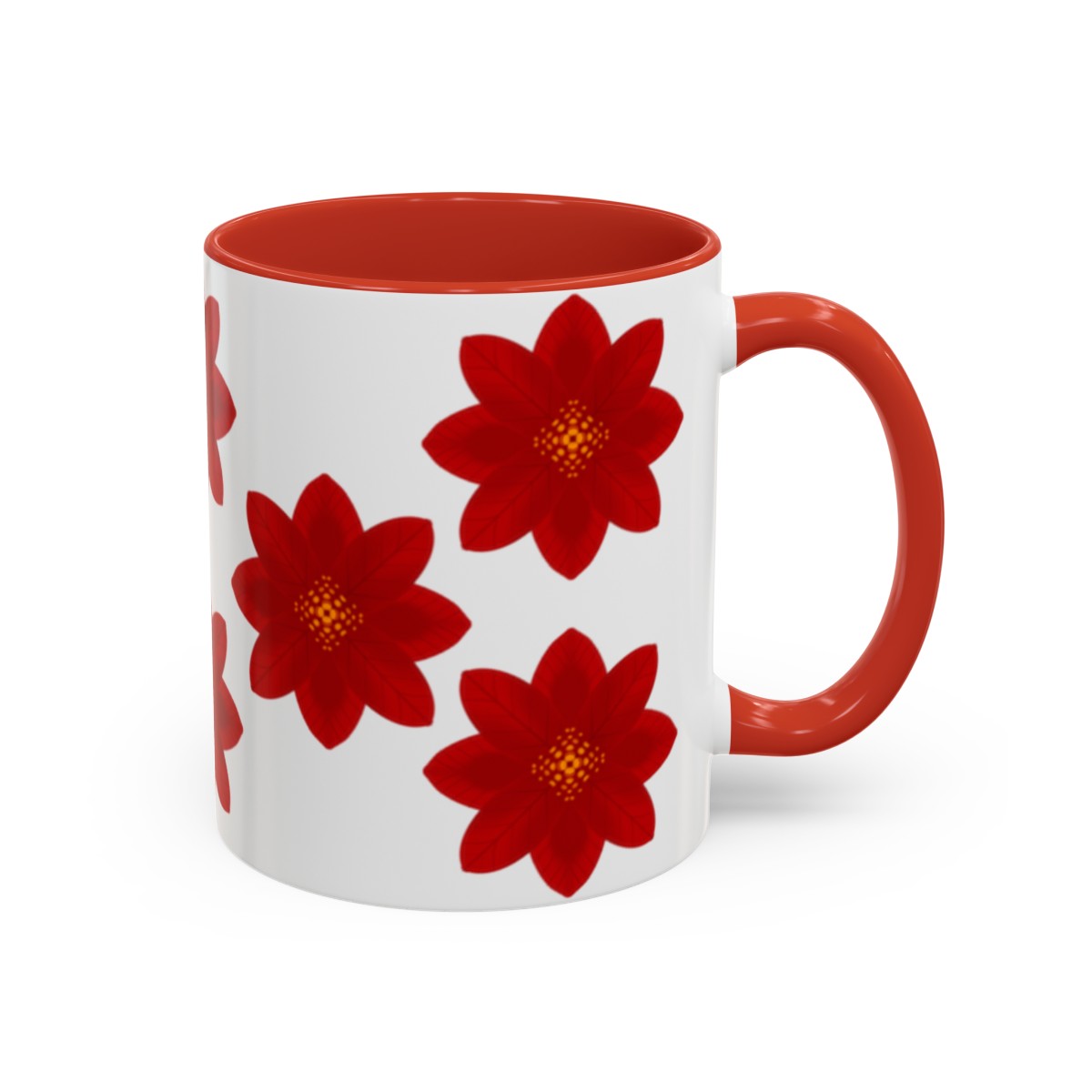 Add some color to your routine with this two-tone, custom accent coffee mug covered in red flowers. This 11oz mug features an accented C-Handle that is comfortable to use, as well as an accented interior to add more contrast and character.