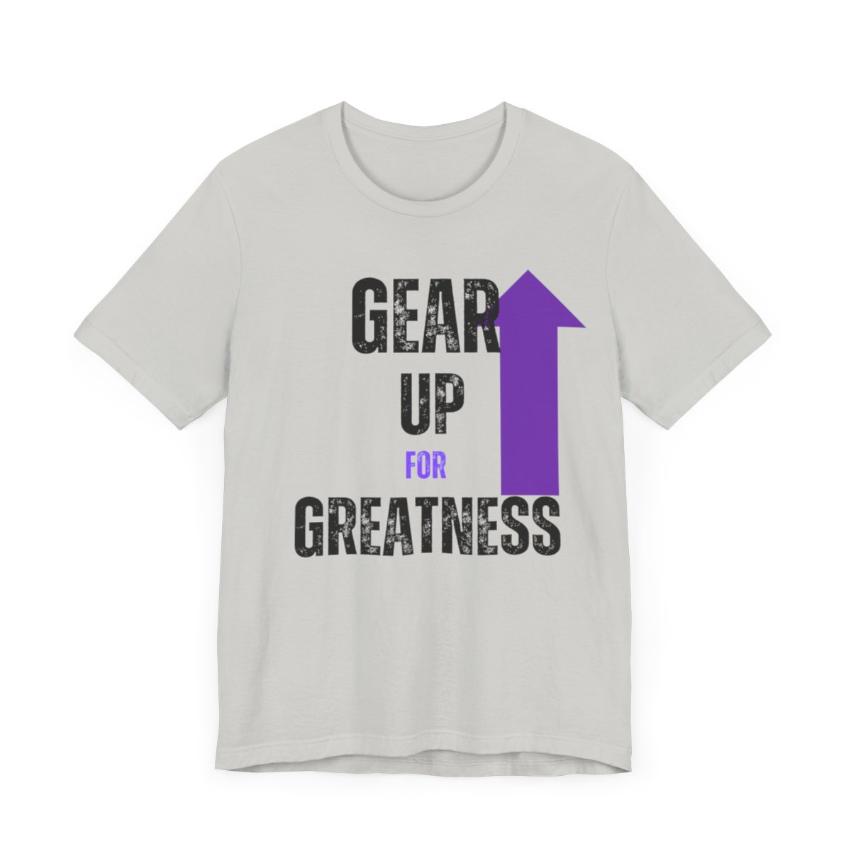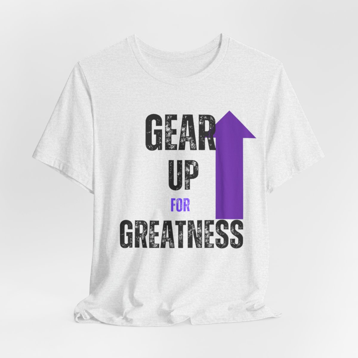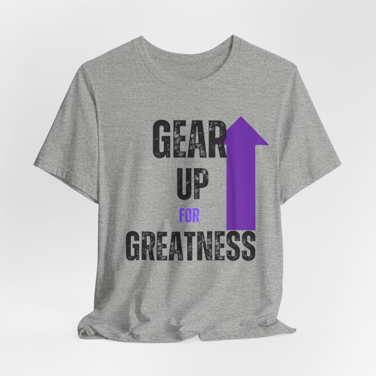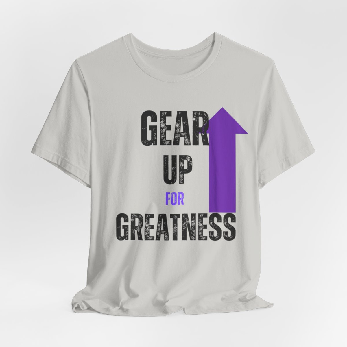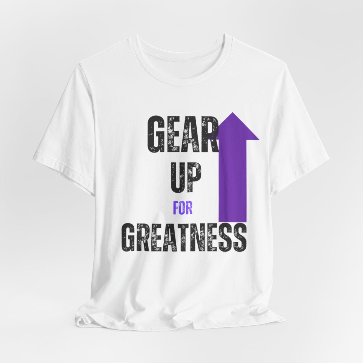 Design: The text is arranged in a stacked formation, with “GEAR UP” on the top line and “FOR GREATNESS” beneath it. The font is modern and easily readable, while a slight distressed texture adds character.