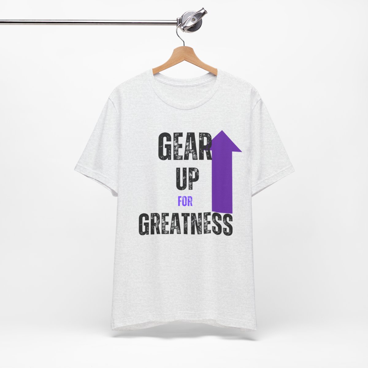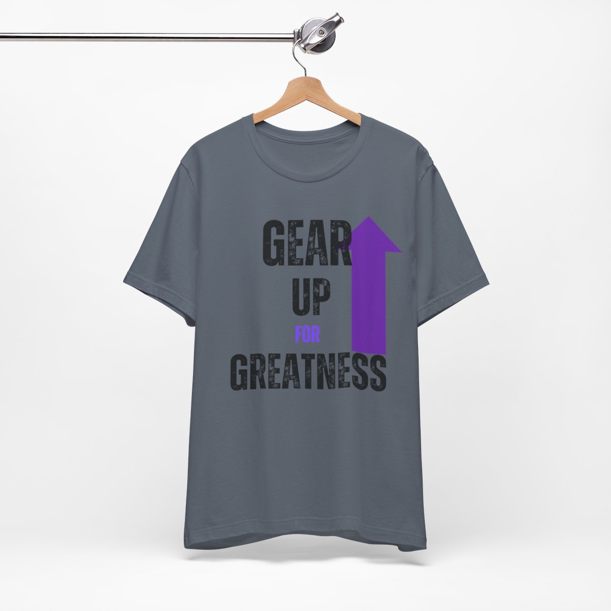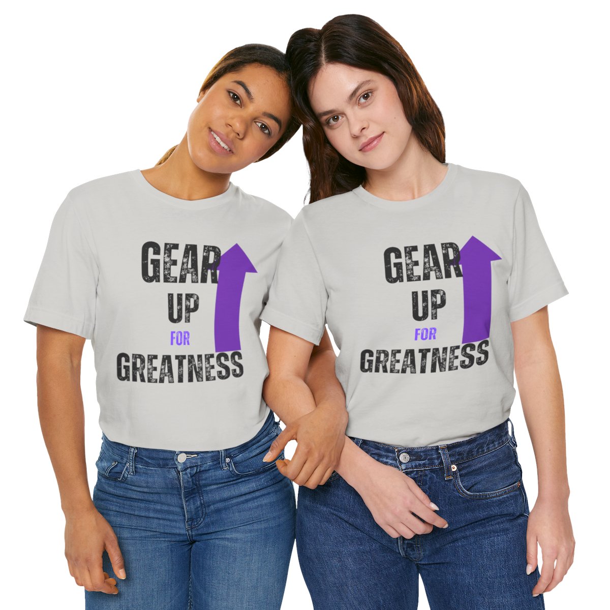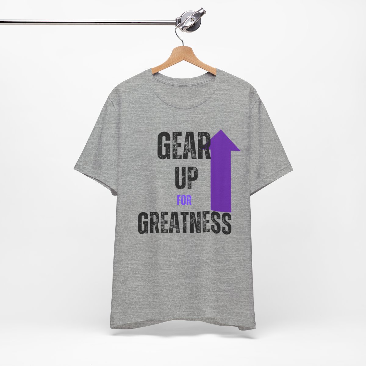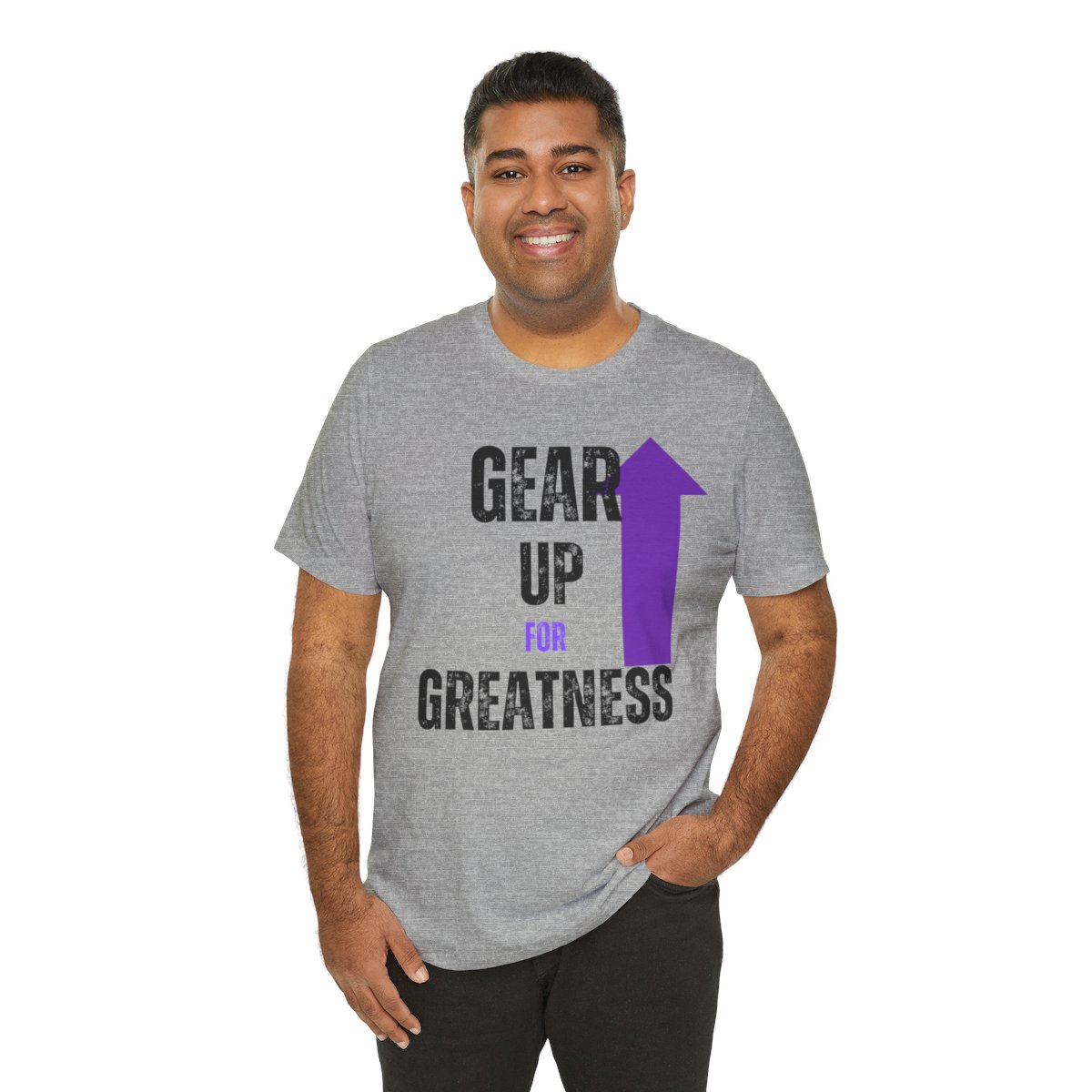 Design: The text is arranged in a stacked formation, with “GEAR UP” on the top line and “FOR GREATNESS” beneath it. The font is modern and easily readable, while a slight distressed texture adds character.