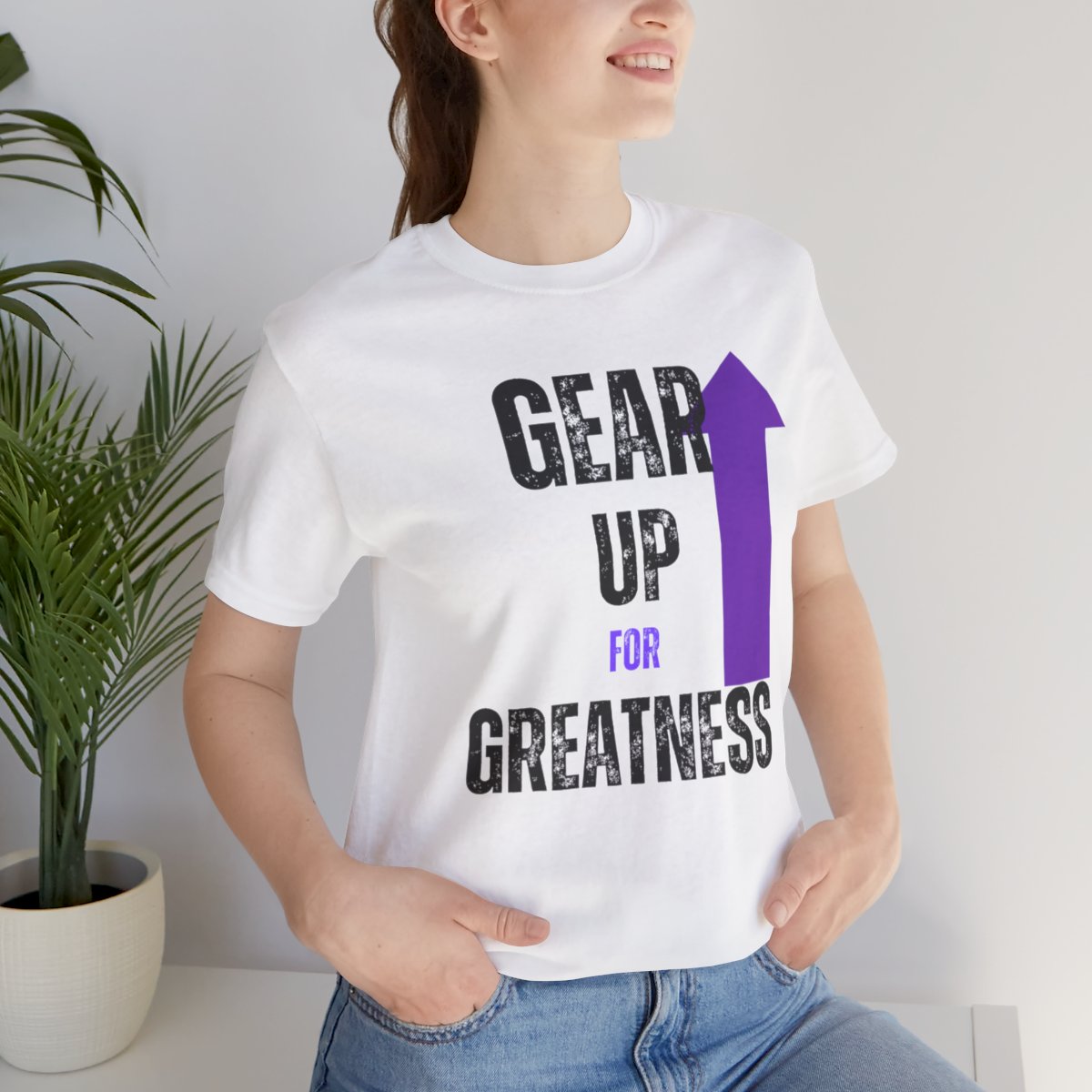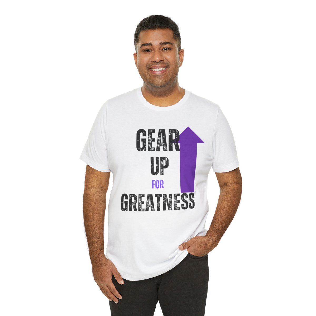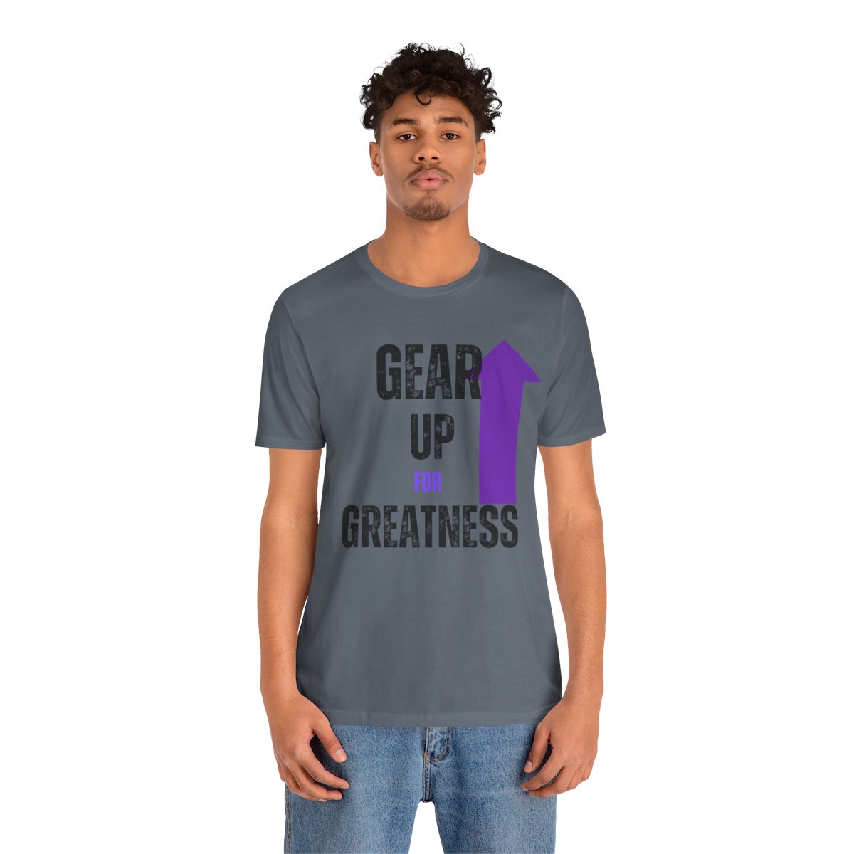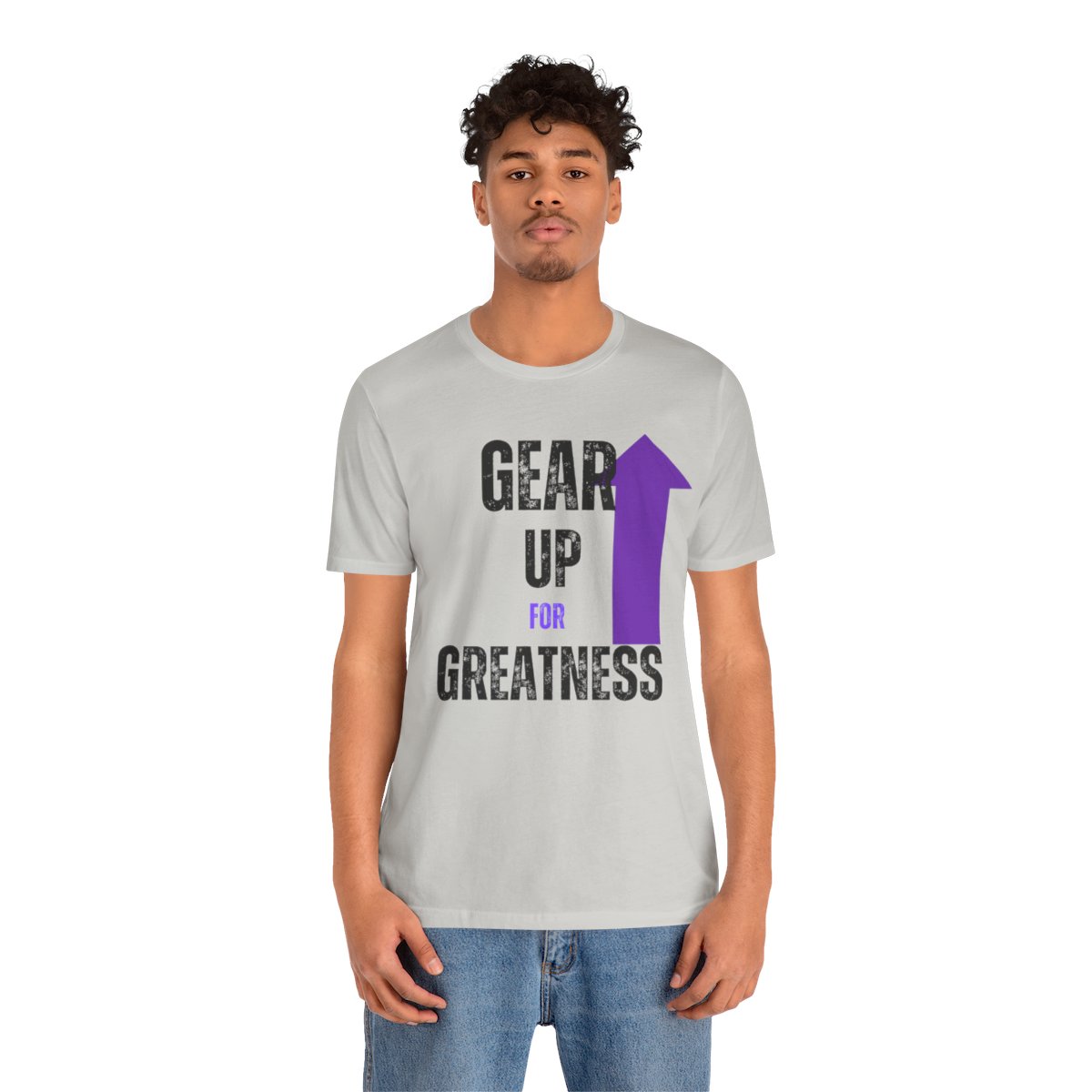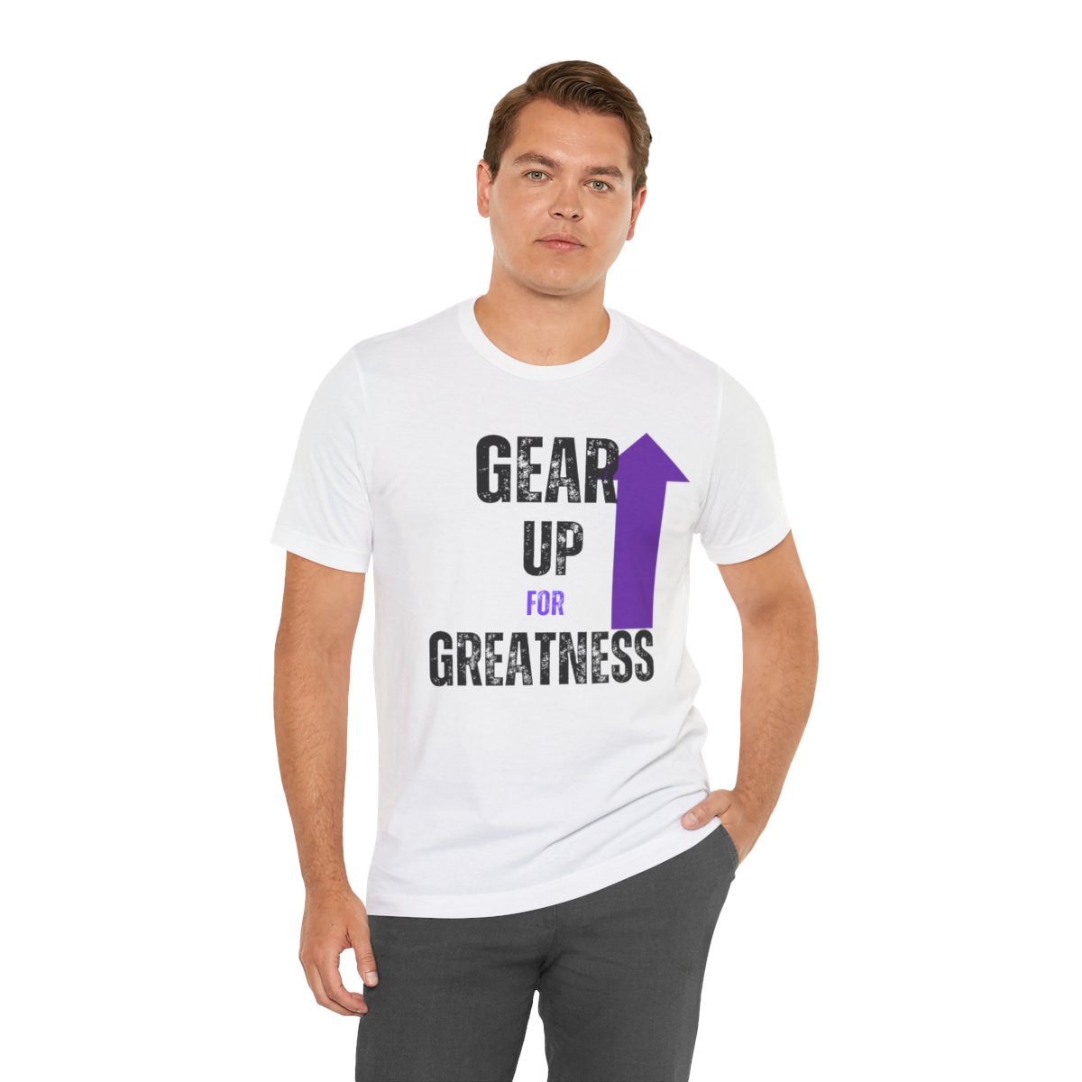 Design: The text is arranged in a stacked formation, with “GEAR UP” on the top line and “FOR GREATNESS” beneath it. The font is modern and easily readable, while a slight distressed texture adds character.