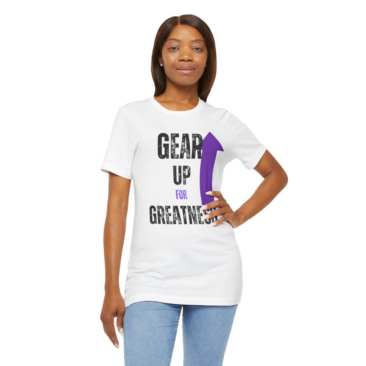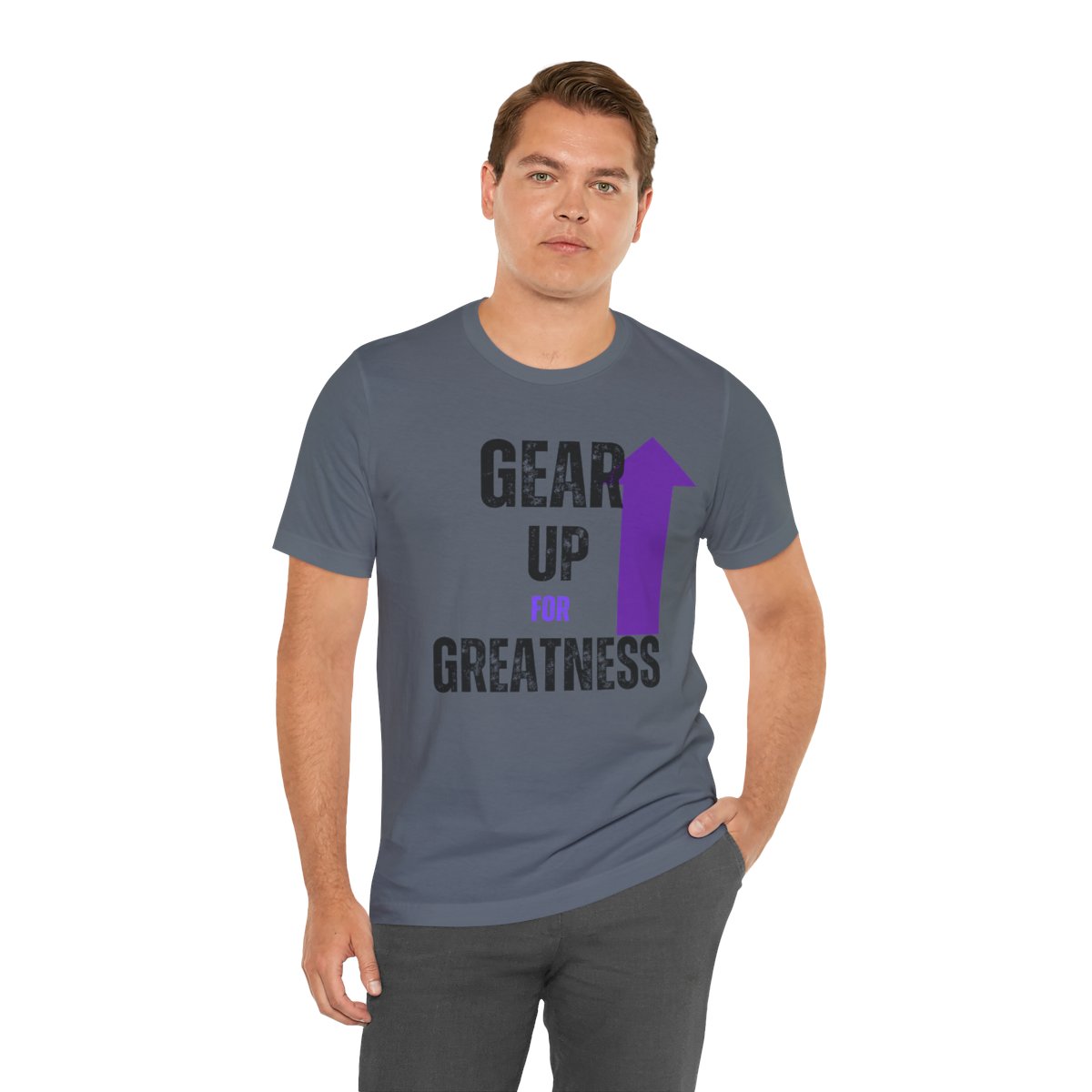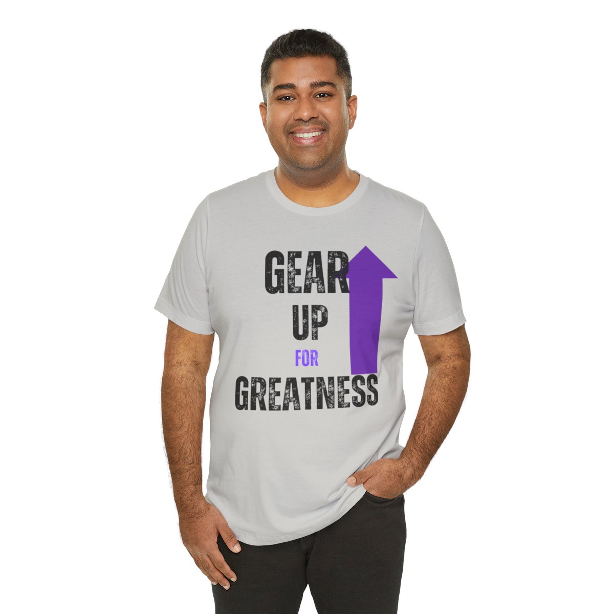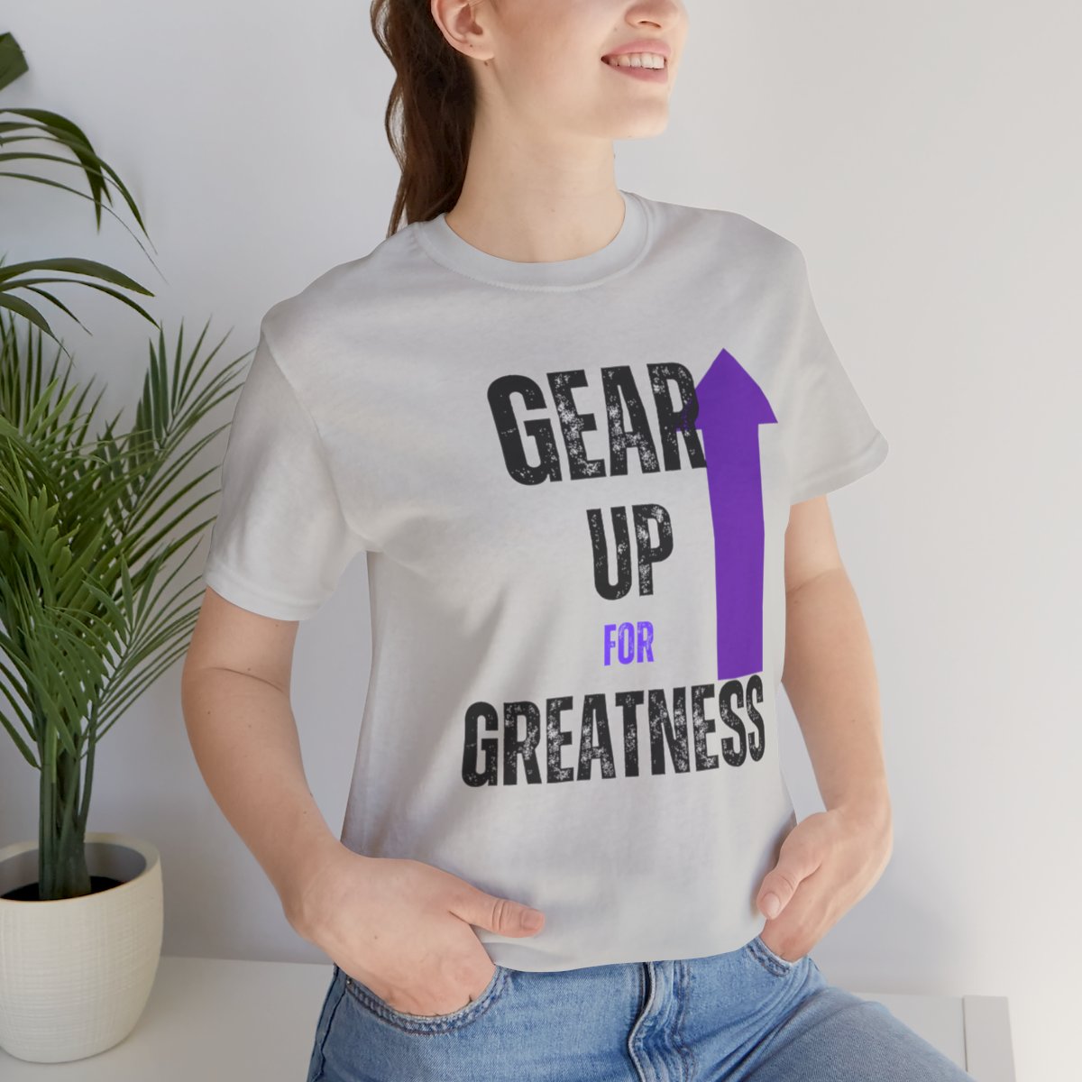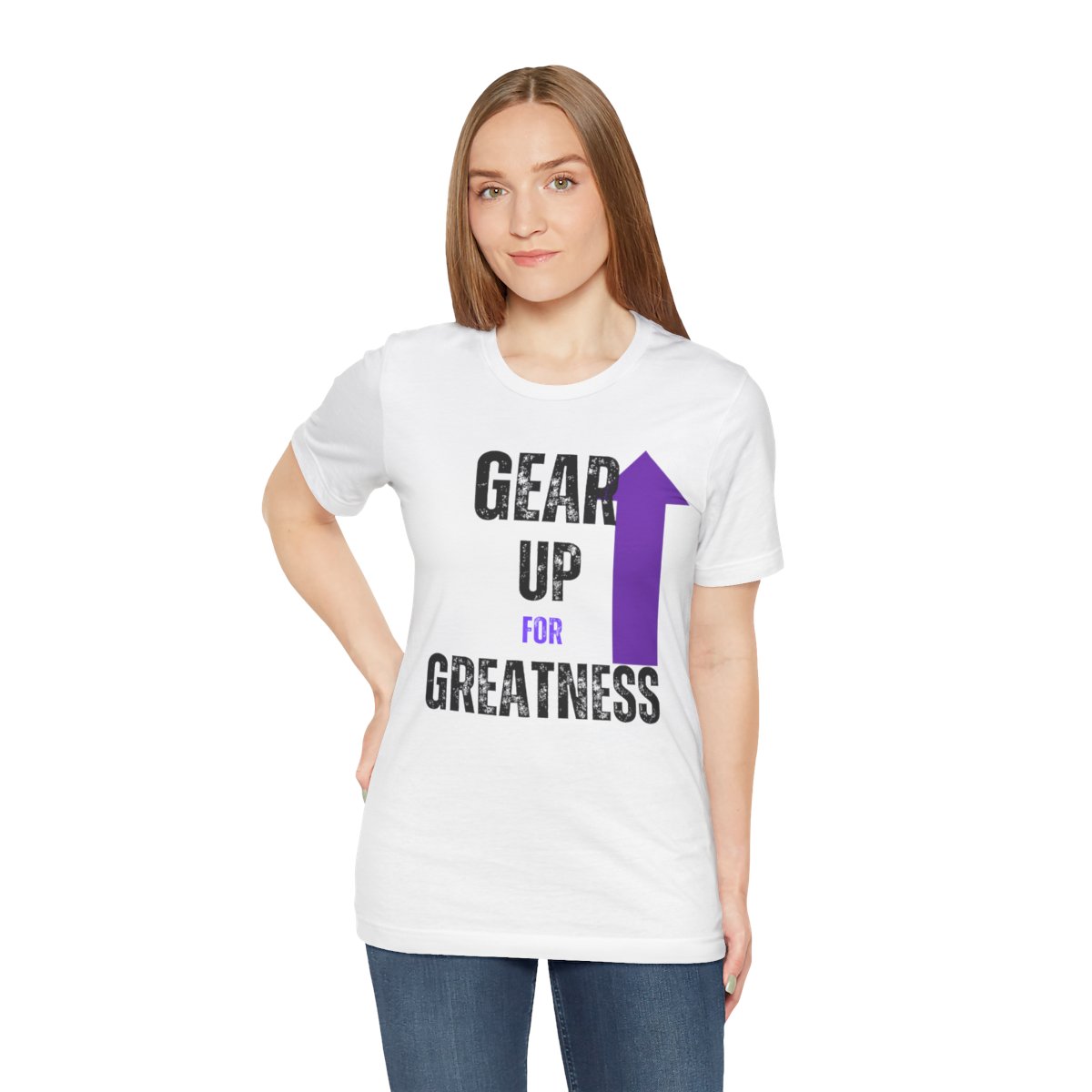 Design: The text is arranged in a stacked formation, with “GEAR UP” on the top line and “FOR GREATNESS” beneath it. The font is modern and easily readable, while a slight distressed texture adds character.