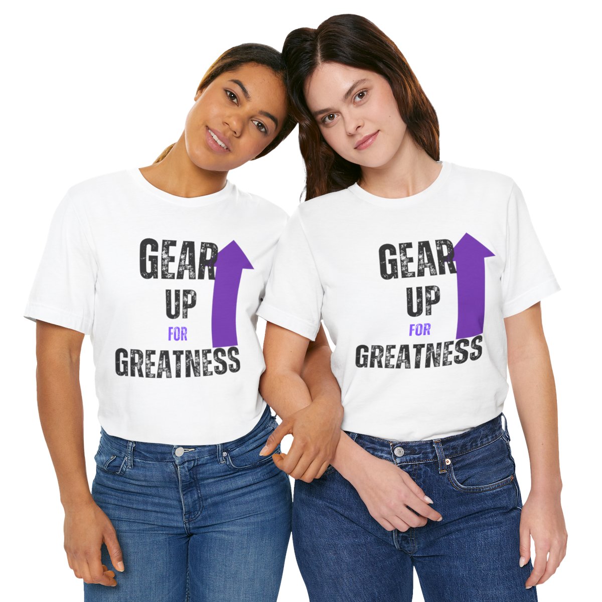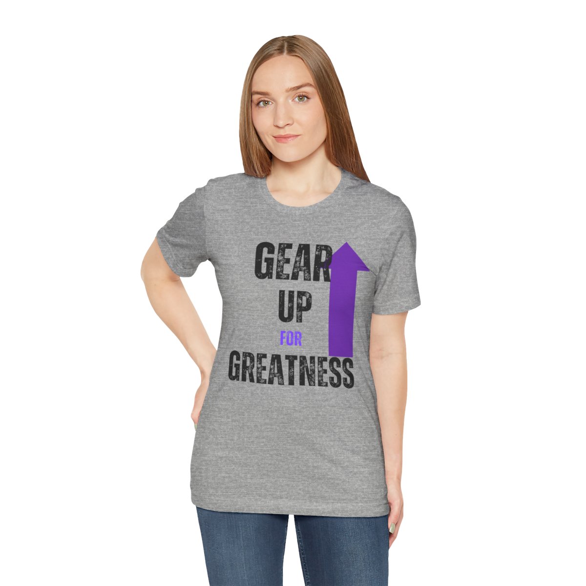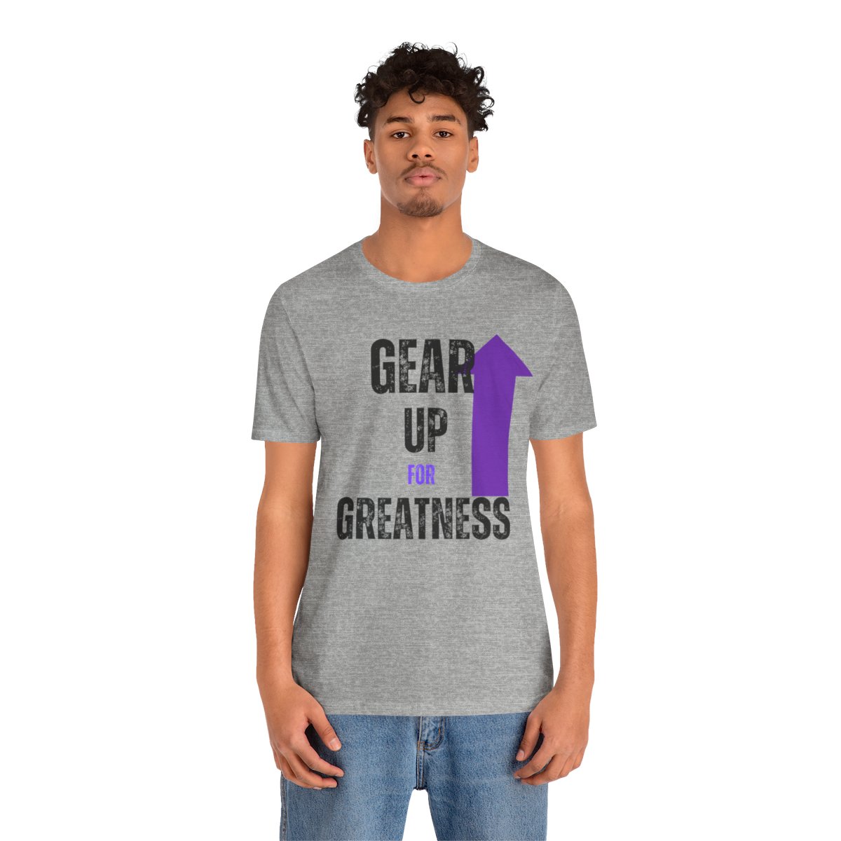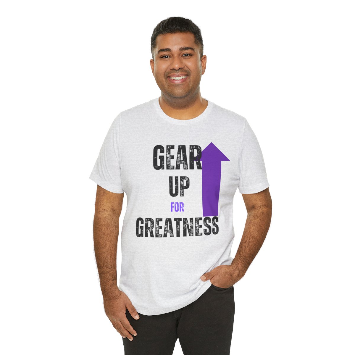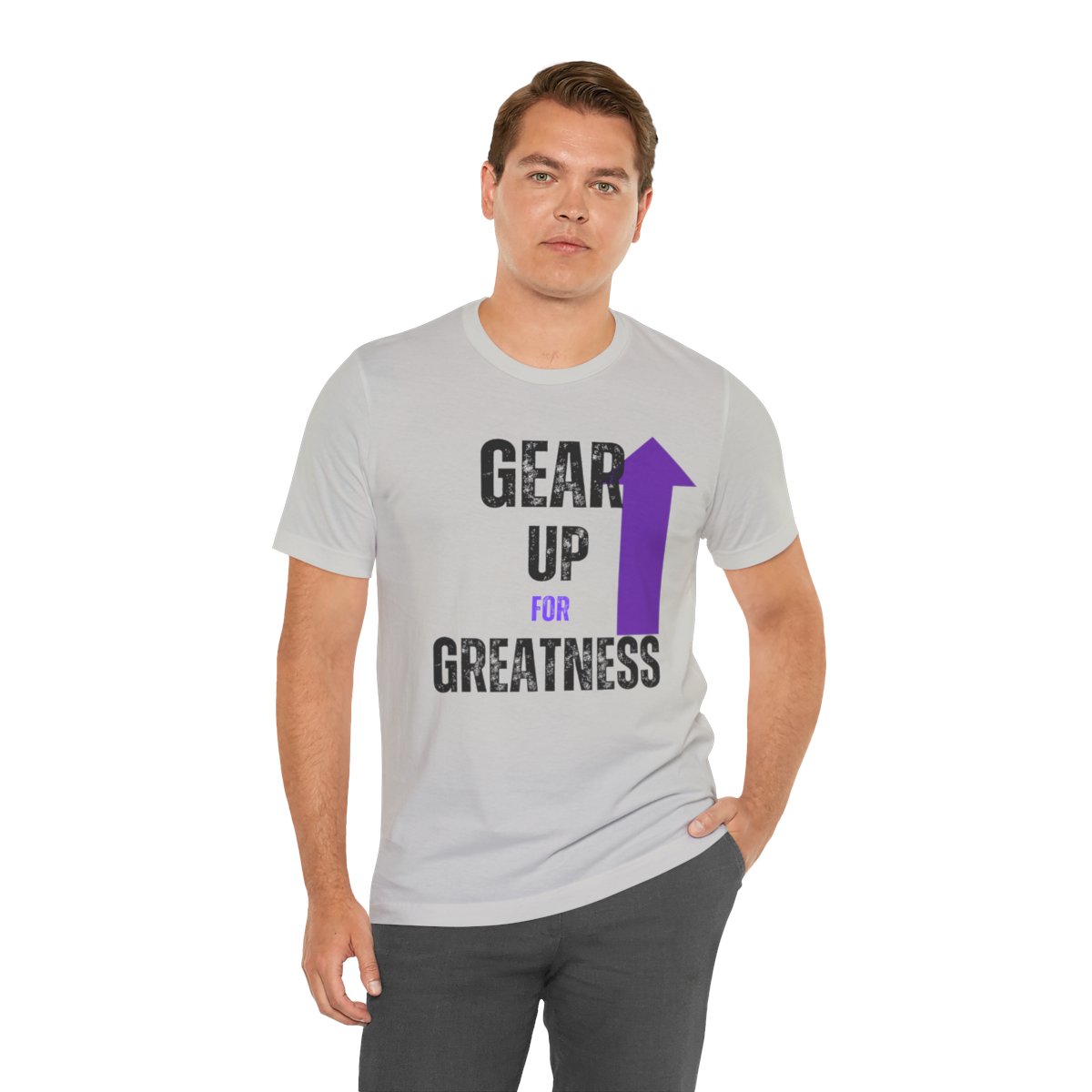 Design: The text is arranged in a stacked formation, with “GEAR UP” on the top line and “FOR GREATNESS” beneath it. The font is modern and easily readable, while a slight distressed texture adds character.