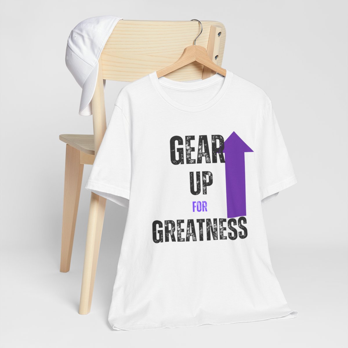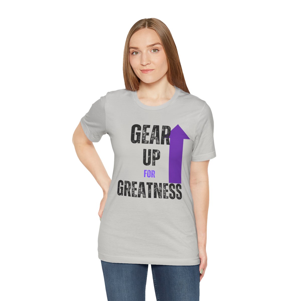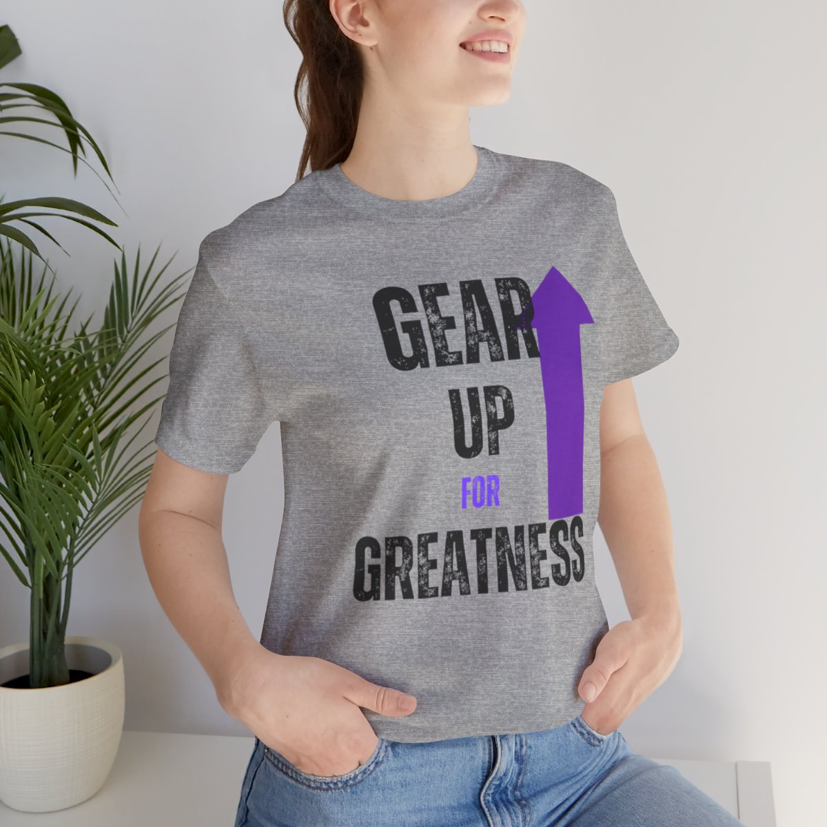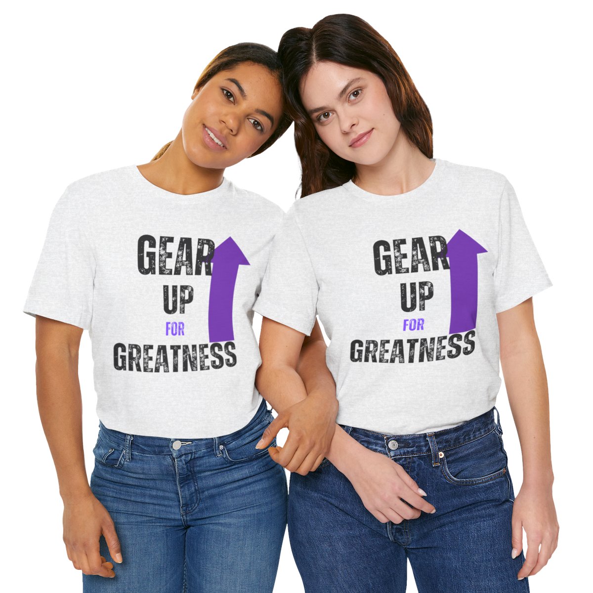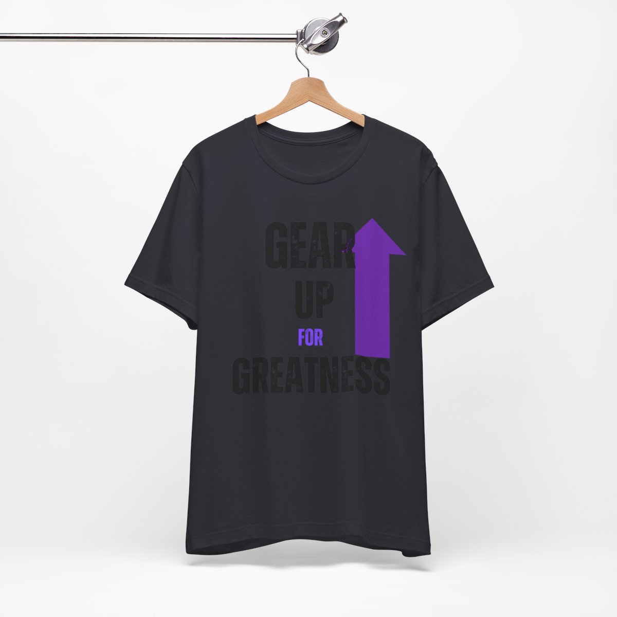 Design: The text is arranged in a stacked formation, with “GEAR UP” on the top line and “FOR GREATNESS” beneath it. The font is modern and easily readable, while a slight distressed texture adds character.