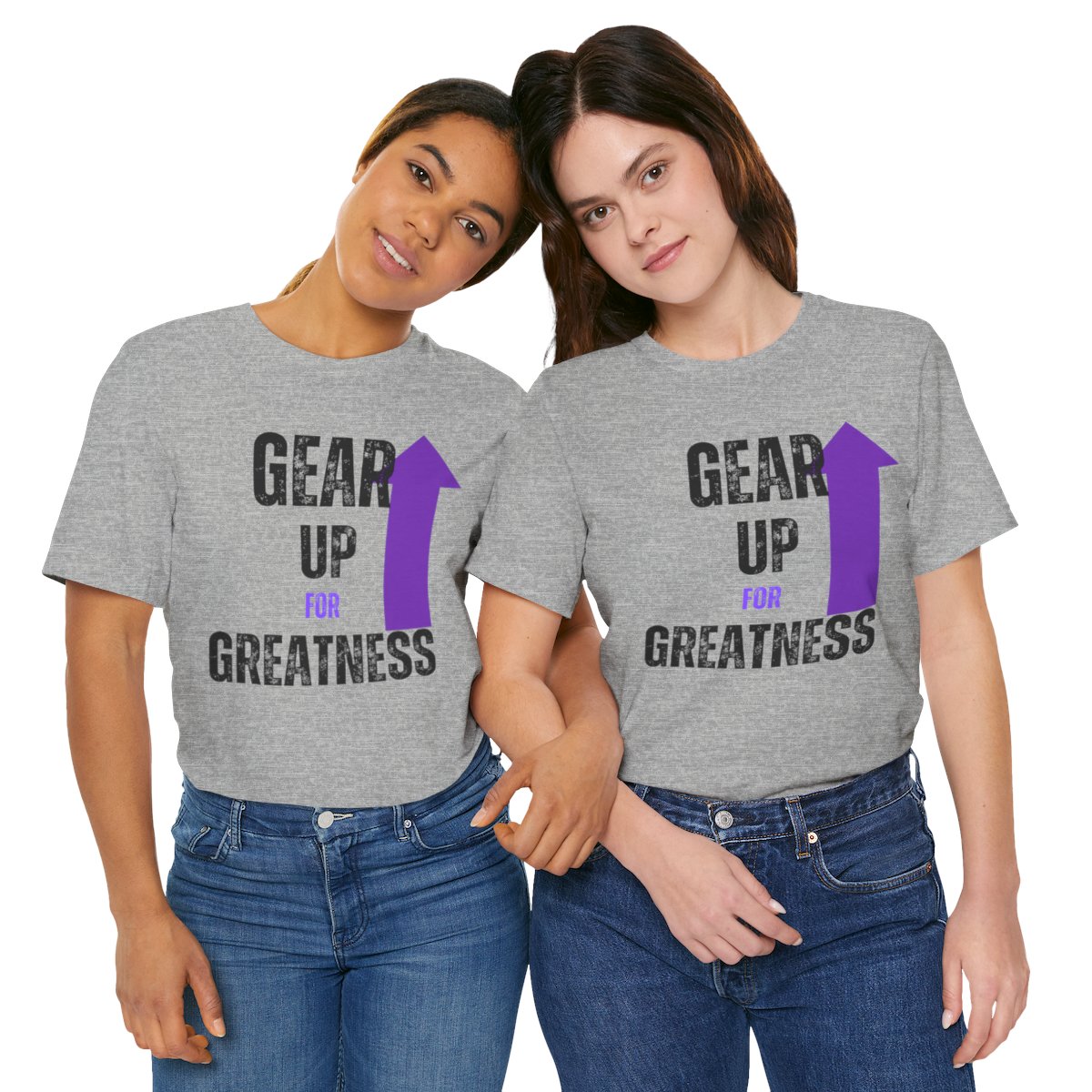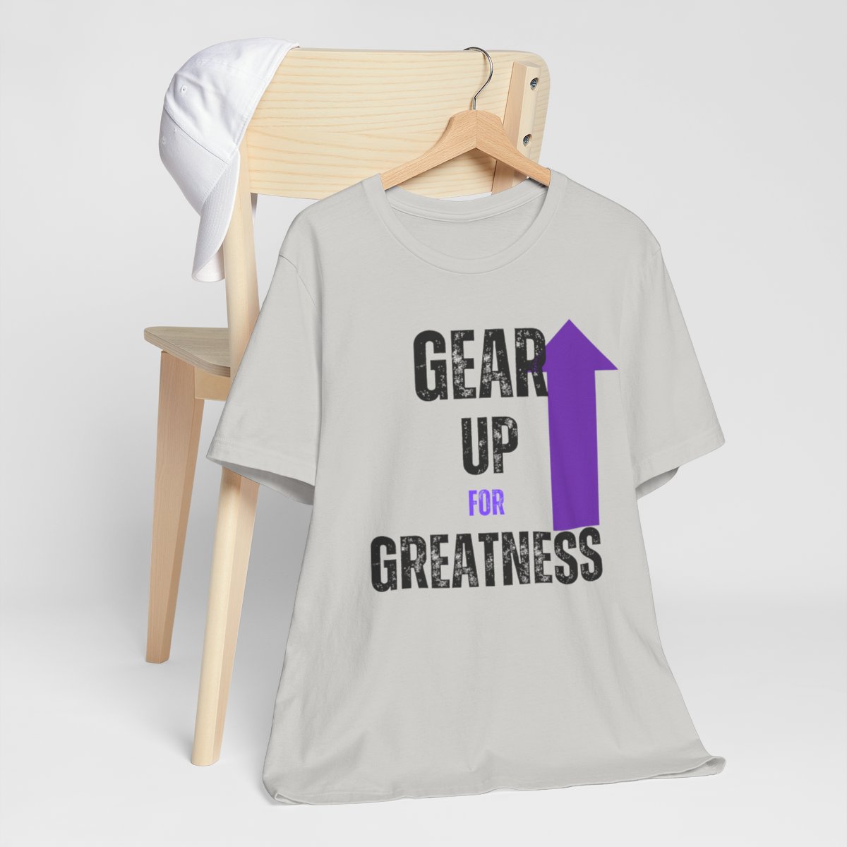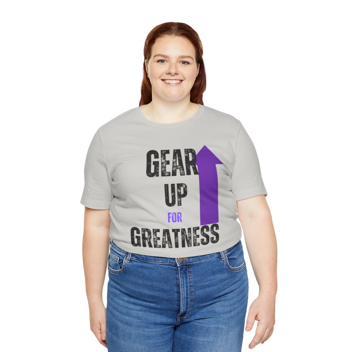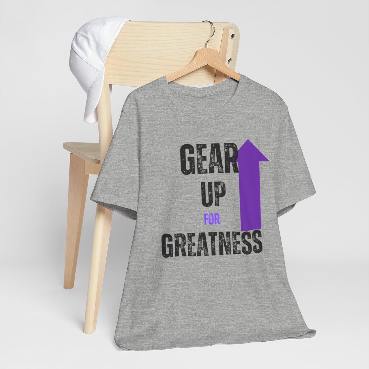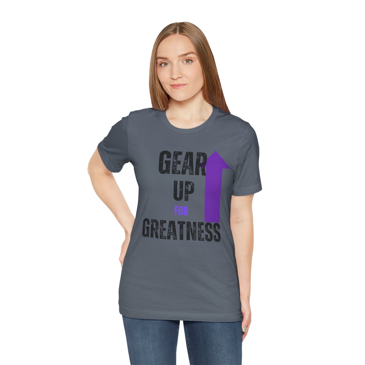 Design: The text is arranged in a stacked formation, with “GEAR UP” on the top line and “FOR GREATNESS” beneath it. The font is modern and easily readable, while a slight distressed texture adds character.