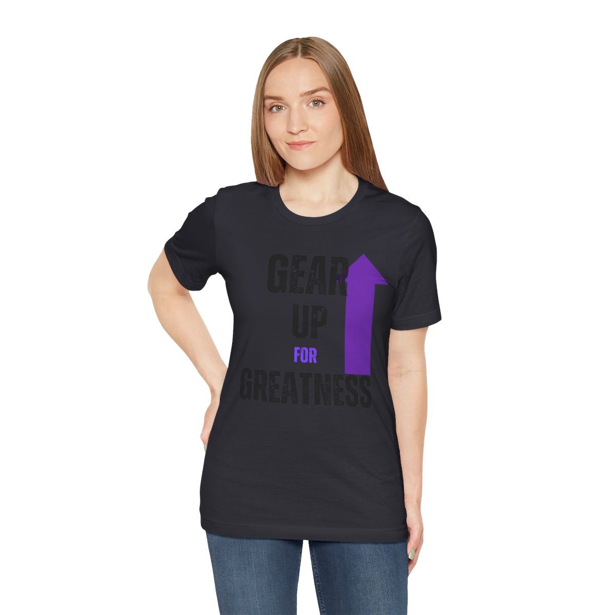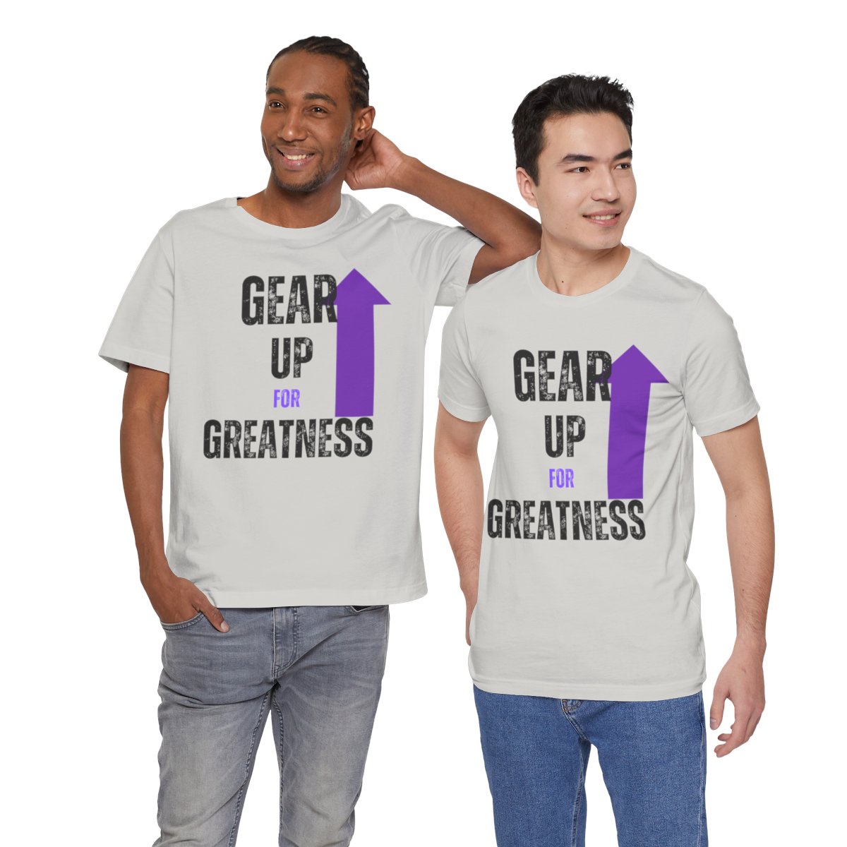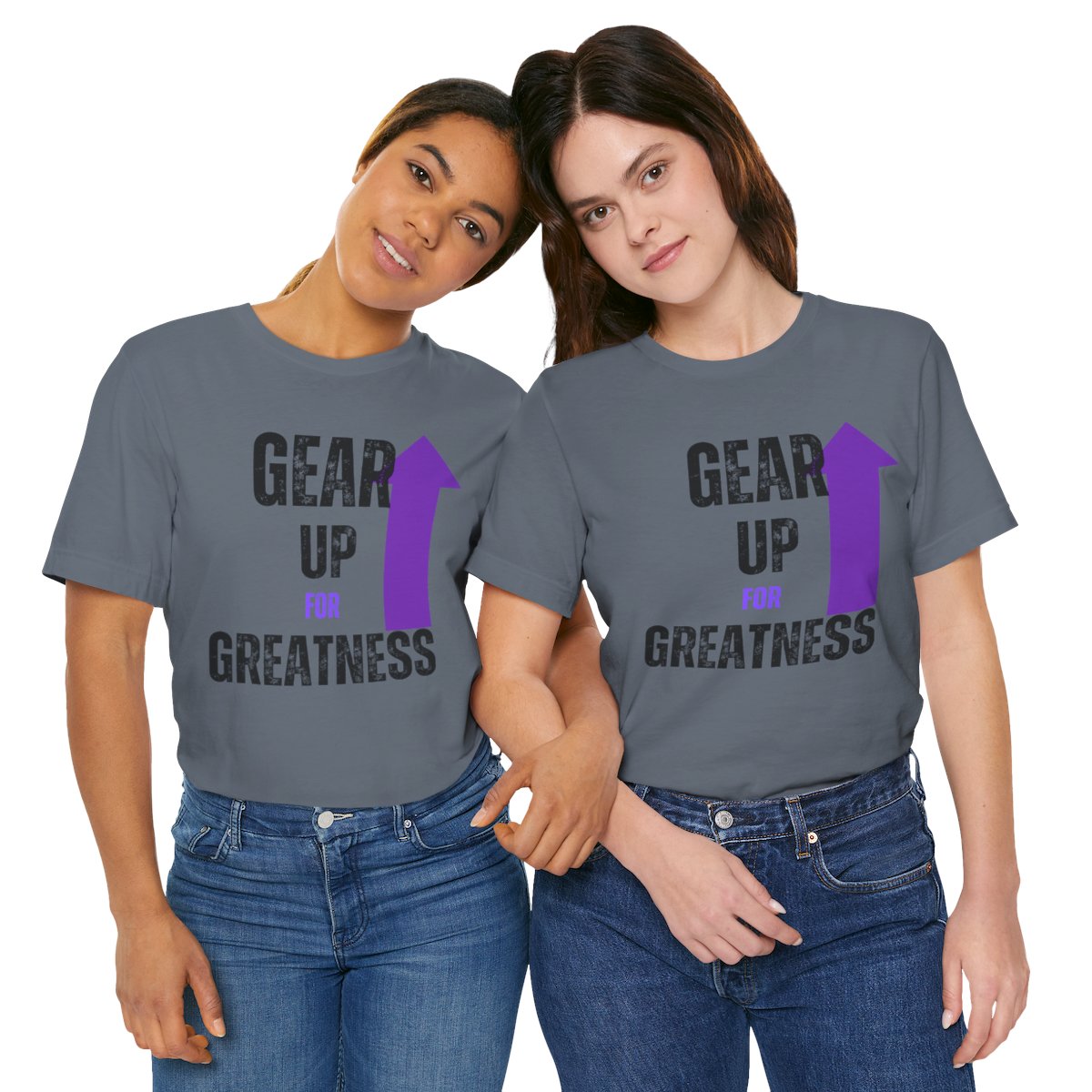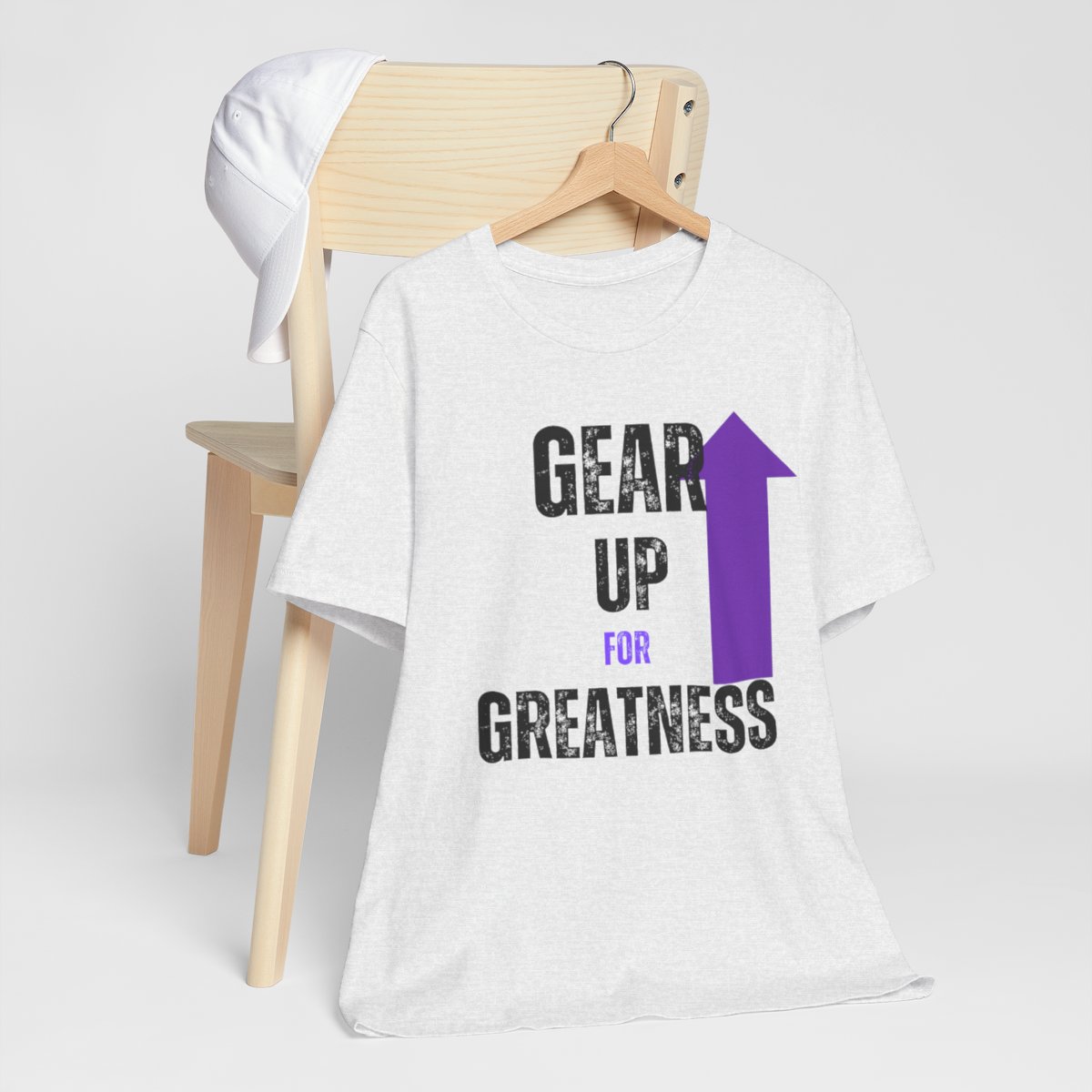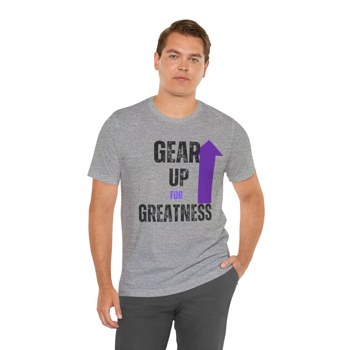 Design: The text is arranged in a stacked formation, with “GEAR UP” on the top line and “FOR GREATNESS” beneath it. The font is modern and easily readable, while a slight distressed texture adds character.