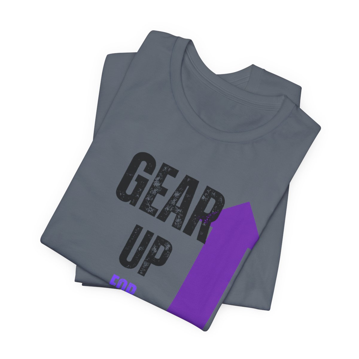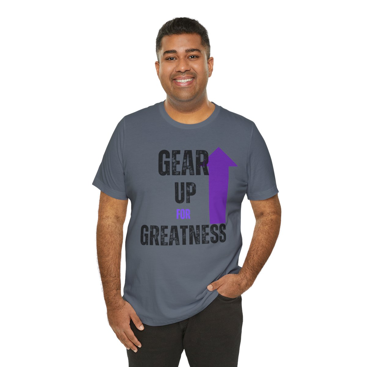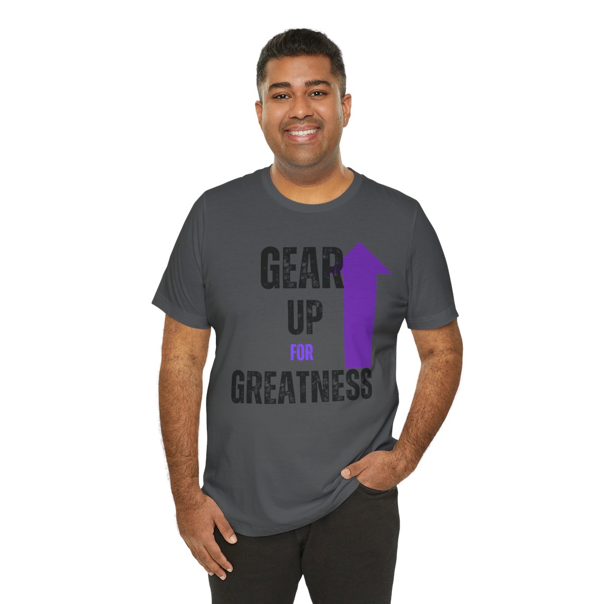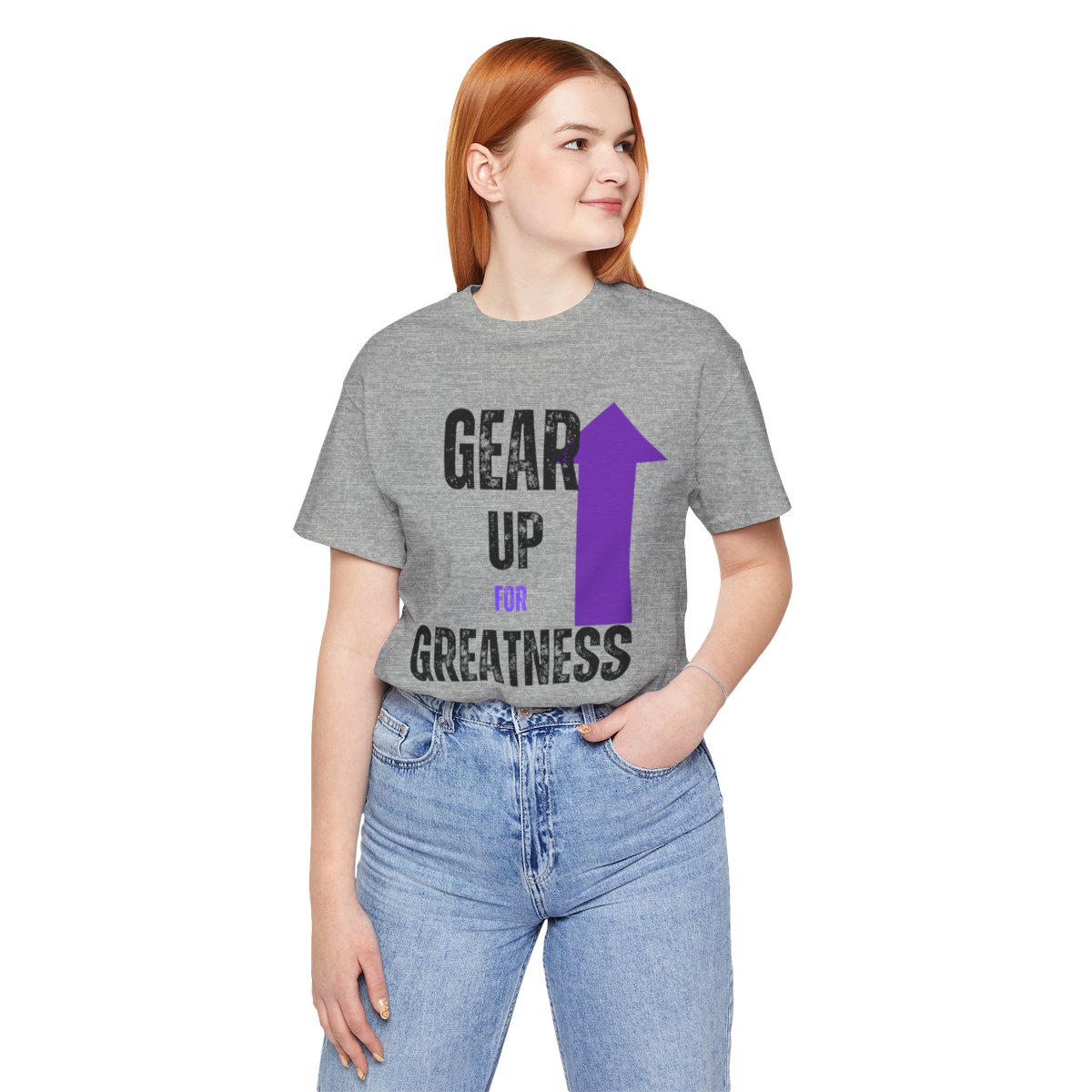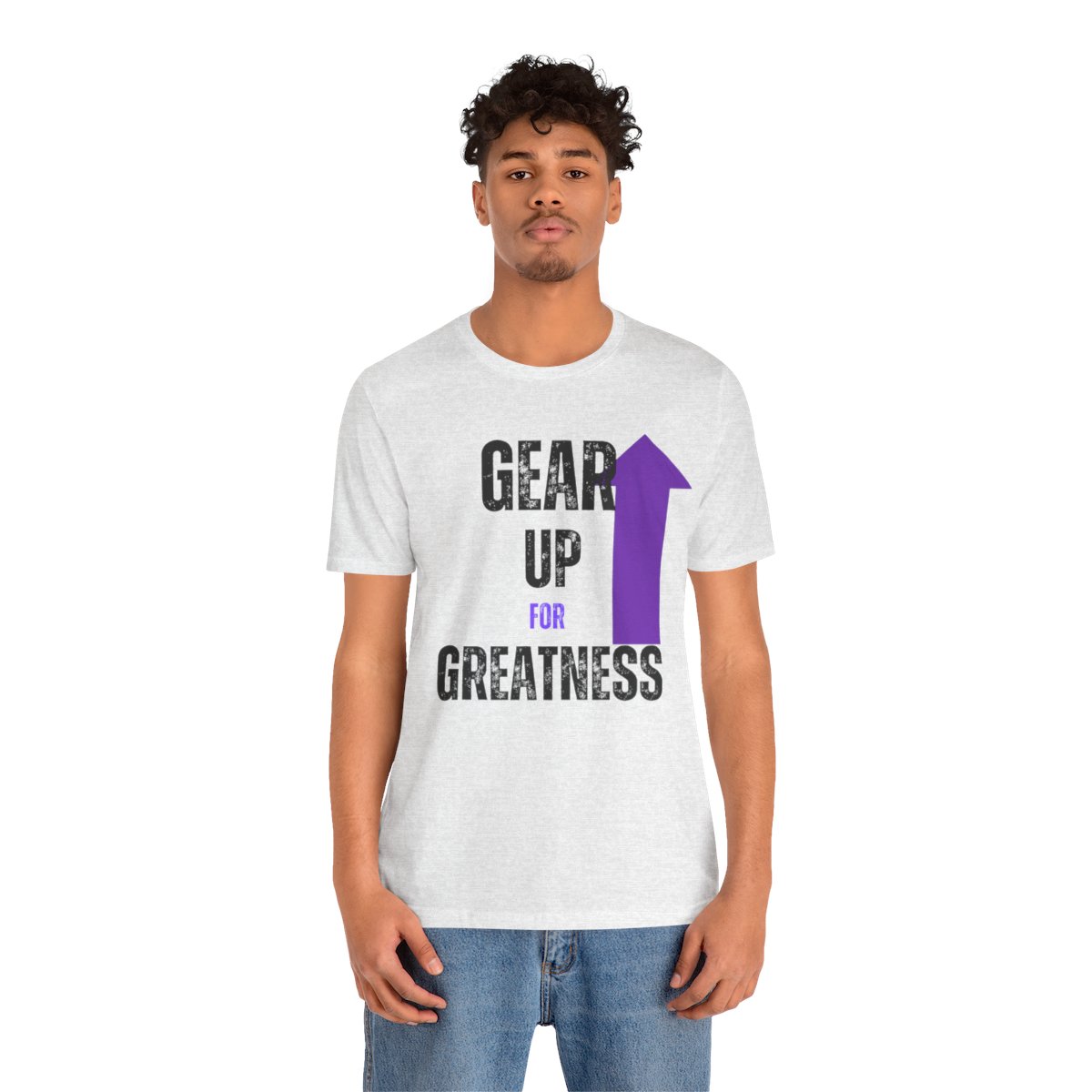 Design: The text is arranged in a stacked formation, with “GEAR UP” on the top line and “FOR GREATNESS” beneath it. The font is modern and easily readable, while a slight distressed texture adds character.