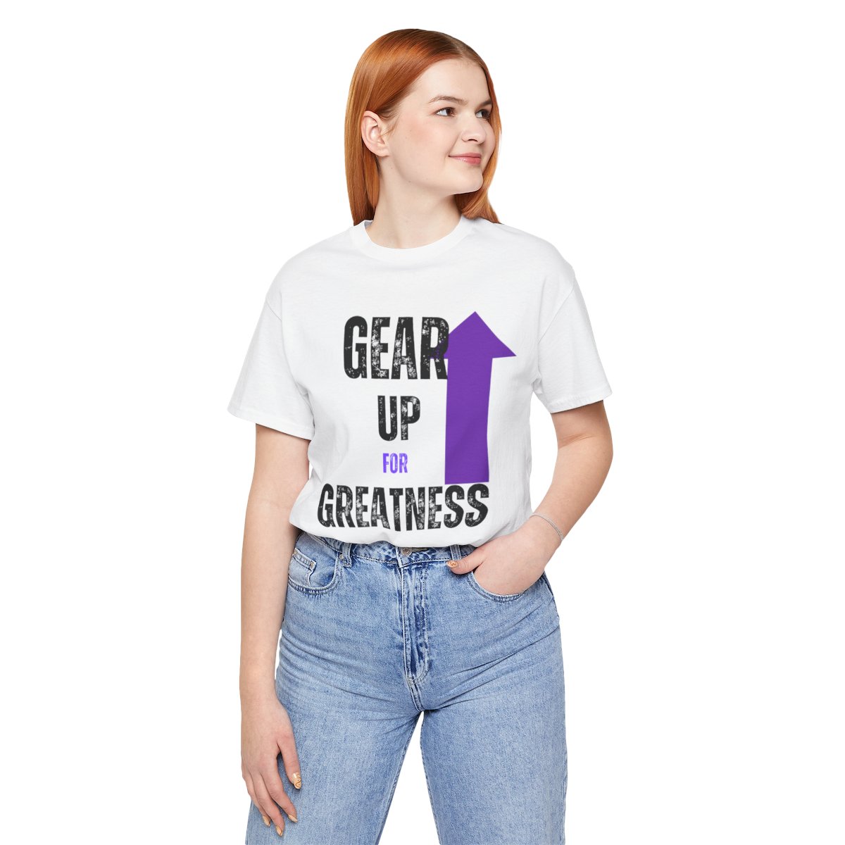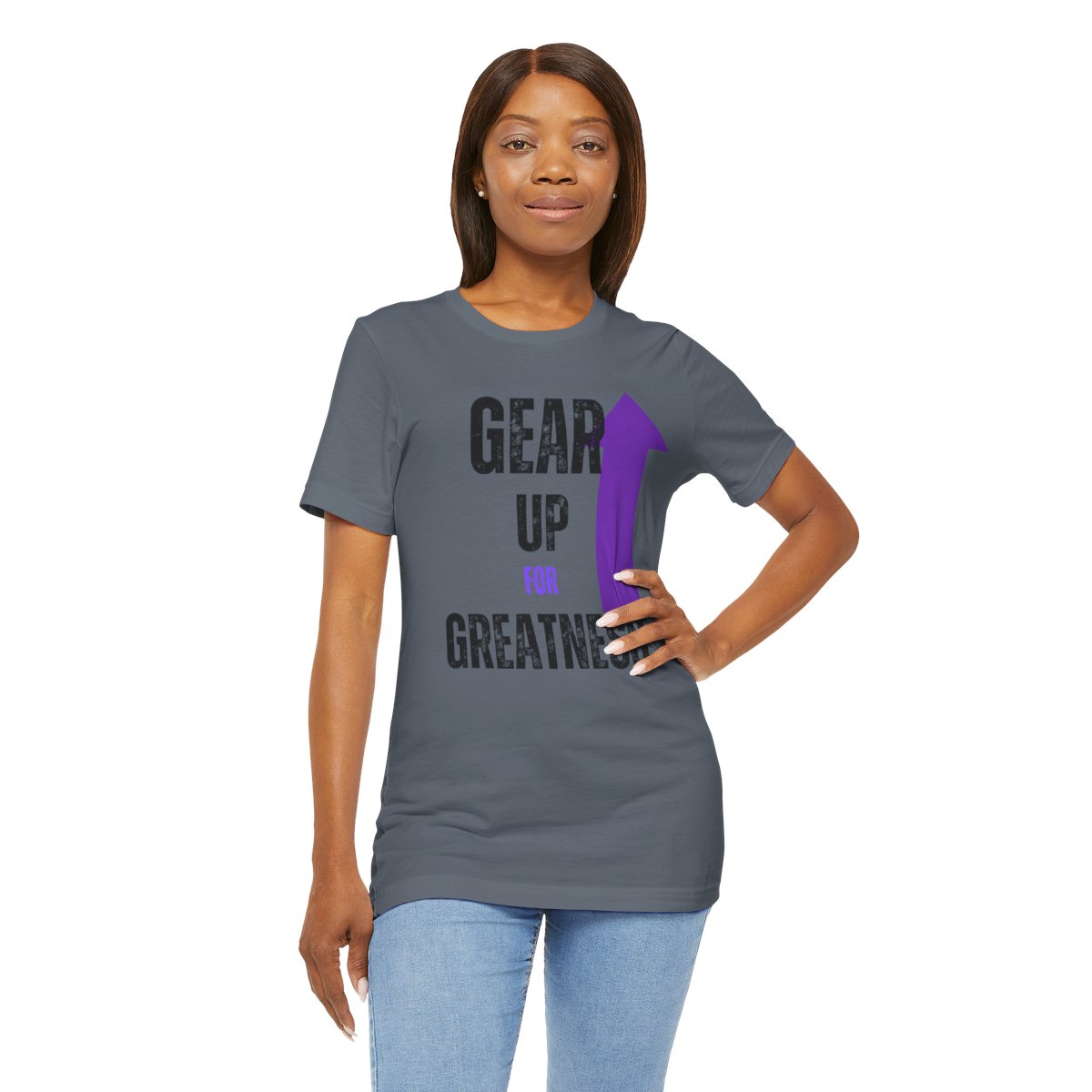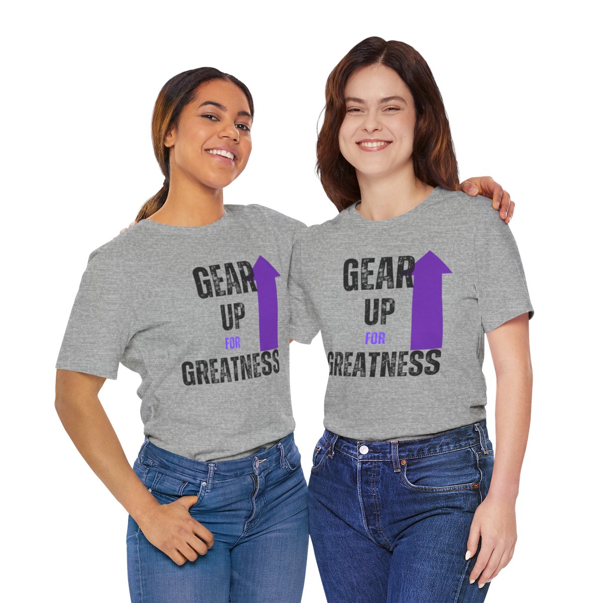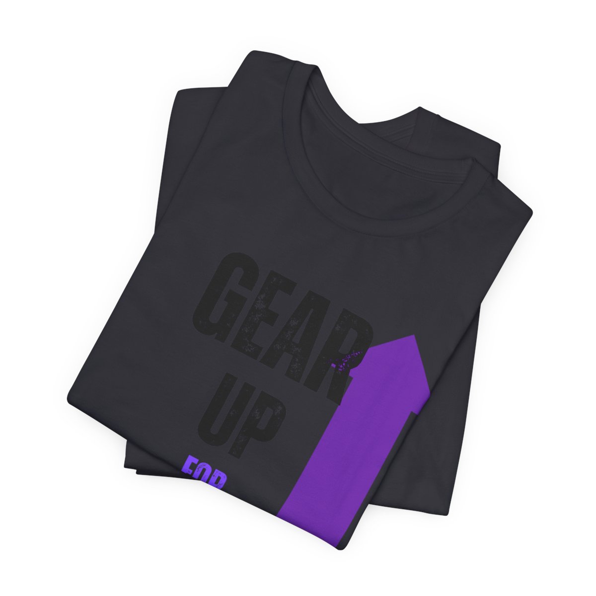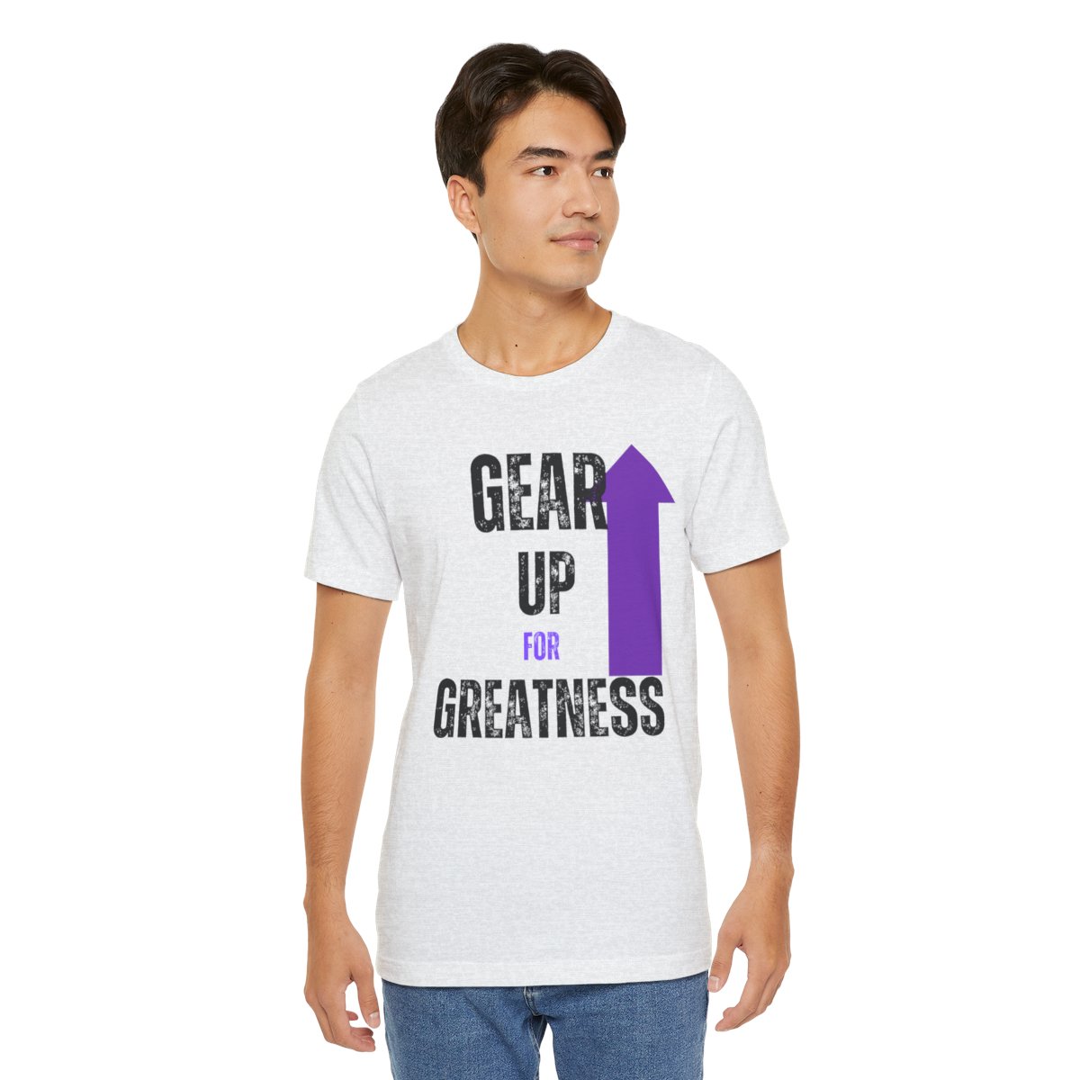 Design: The text is arranged in a stacked formation, with “GEAR UP” on the top line and “FOR GREATNESS” beneath it. The font is modern and easily readable, while a slight distressed texture adds character.