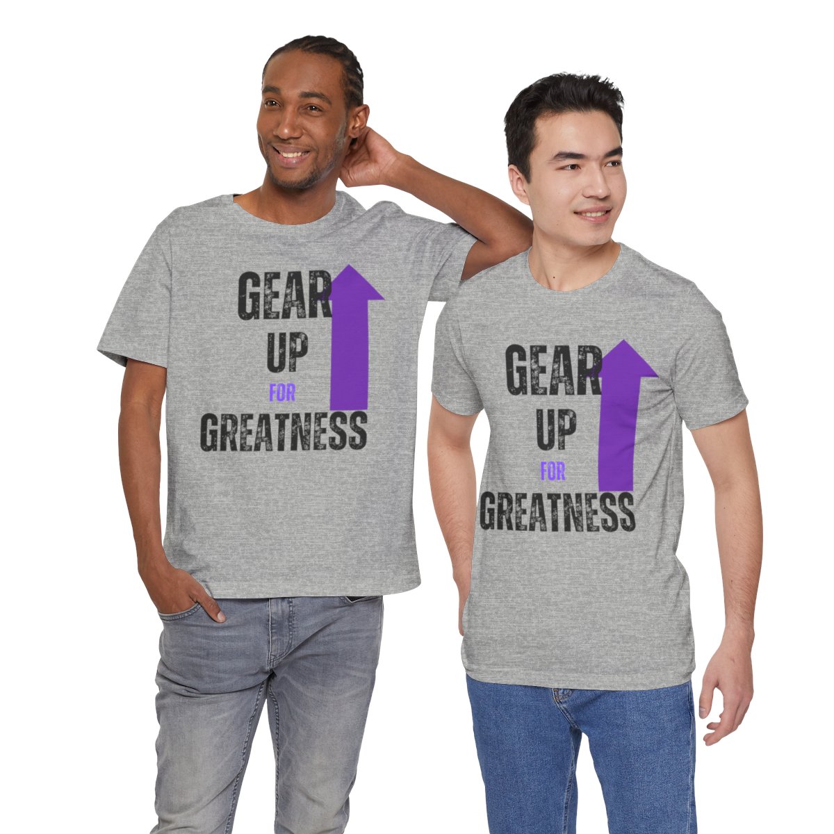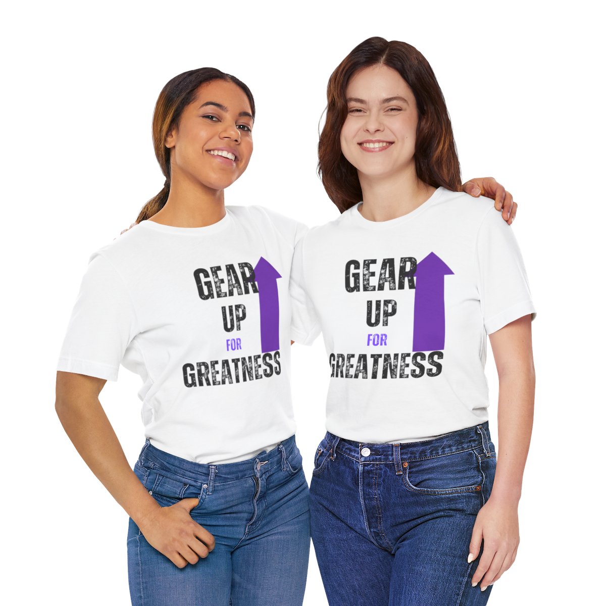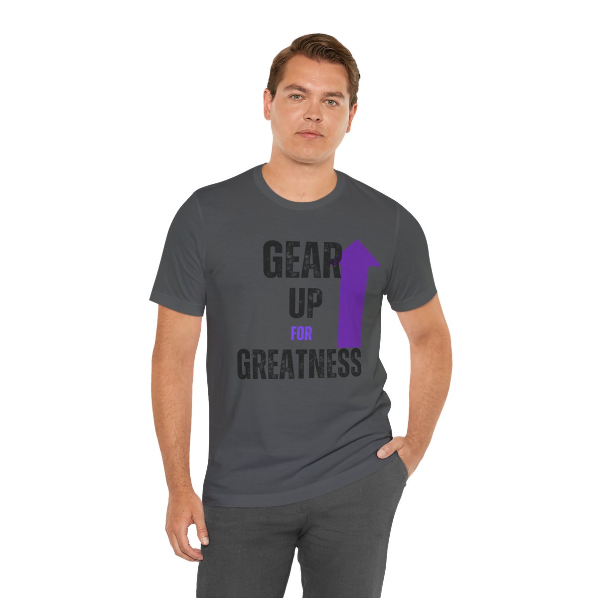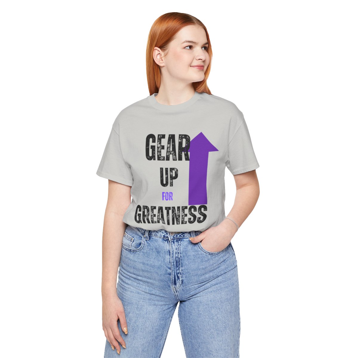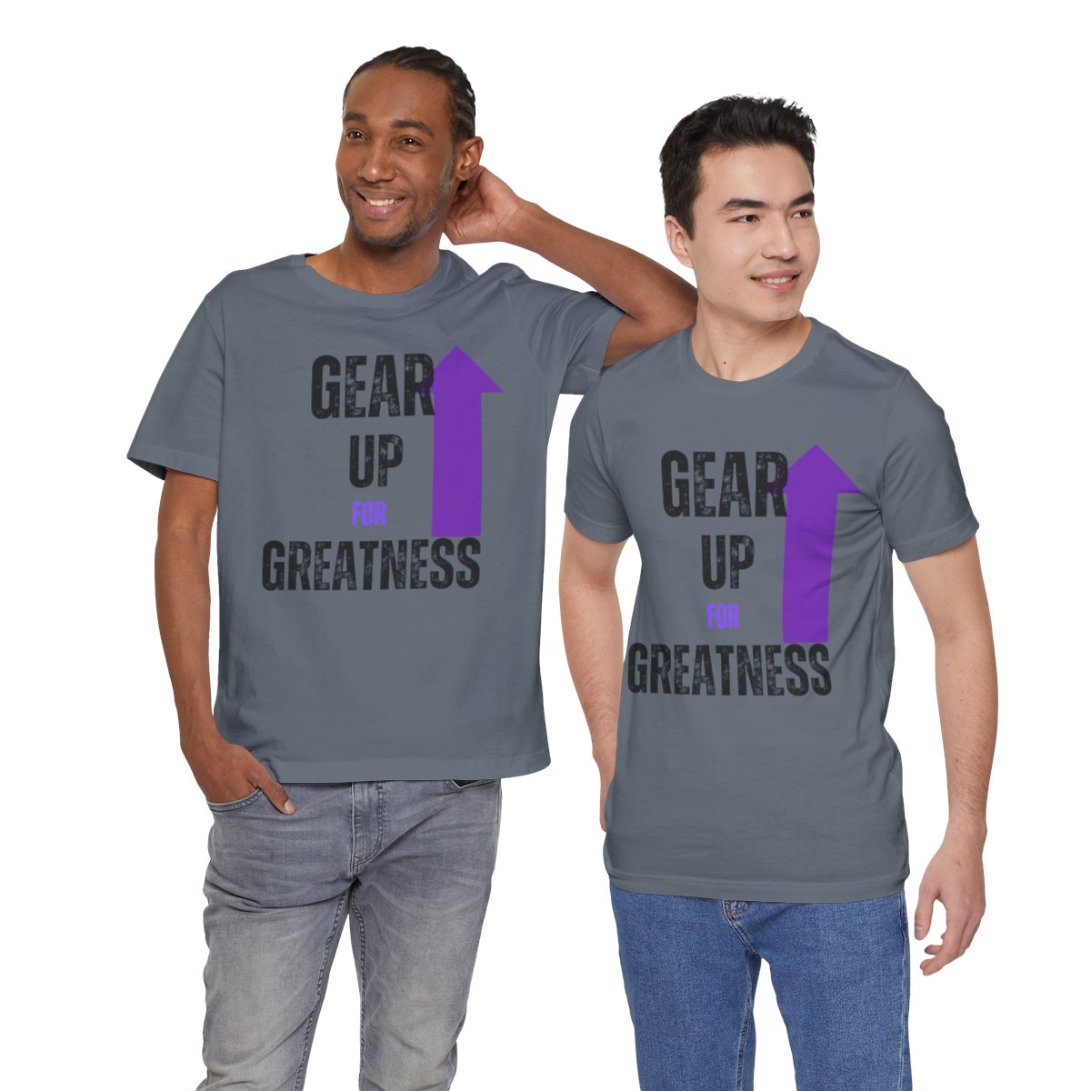 Design: The text is arranged in a stacked formation, with “GEAR UP” on the top line and “FOR GREATNESS” beneath it. The font is modern and easily readable, while a slight distressed texture adds character.