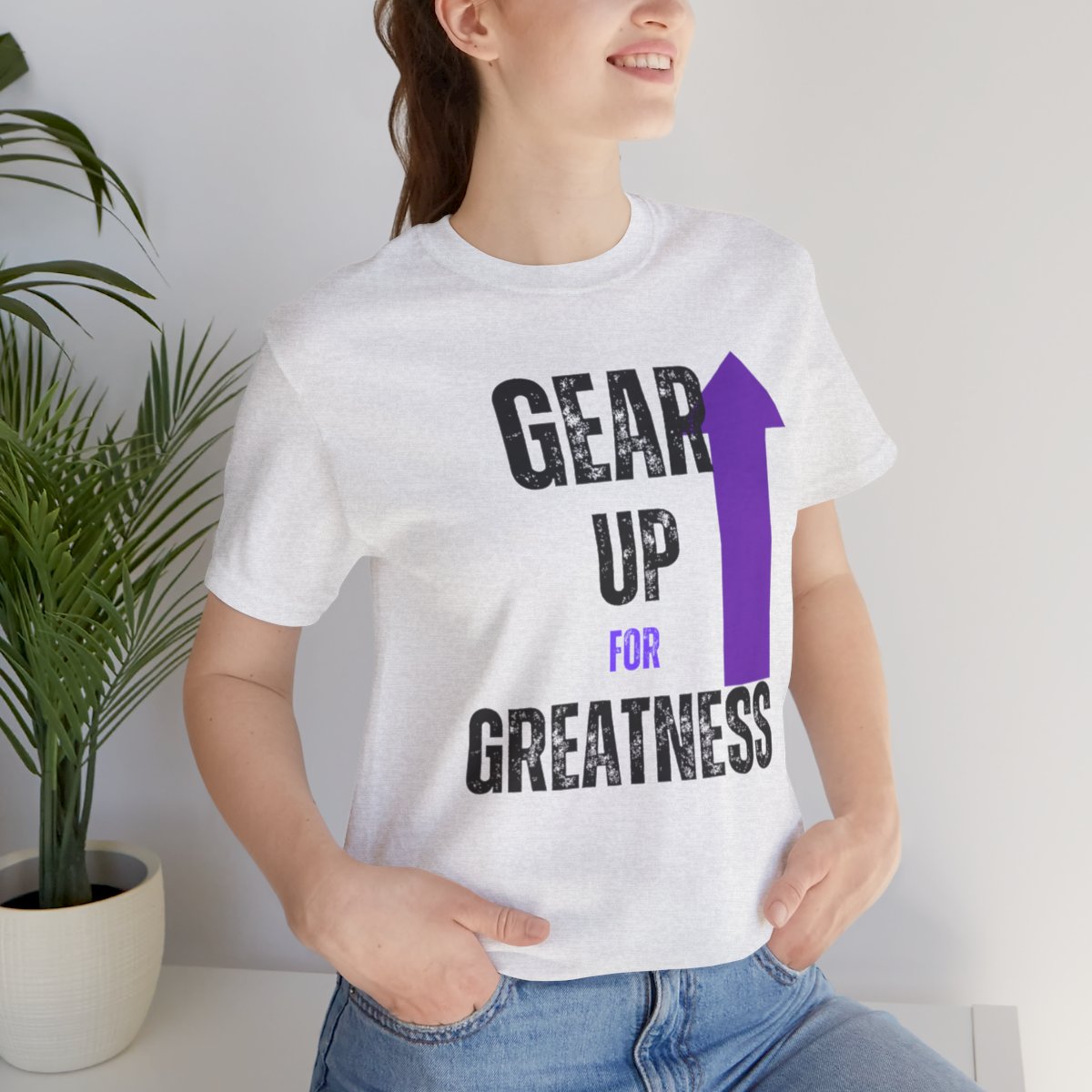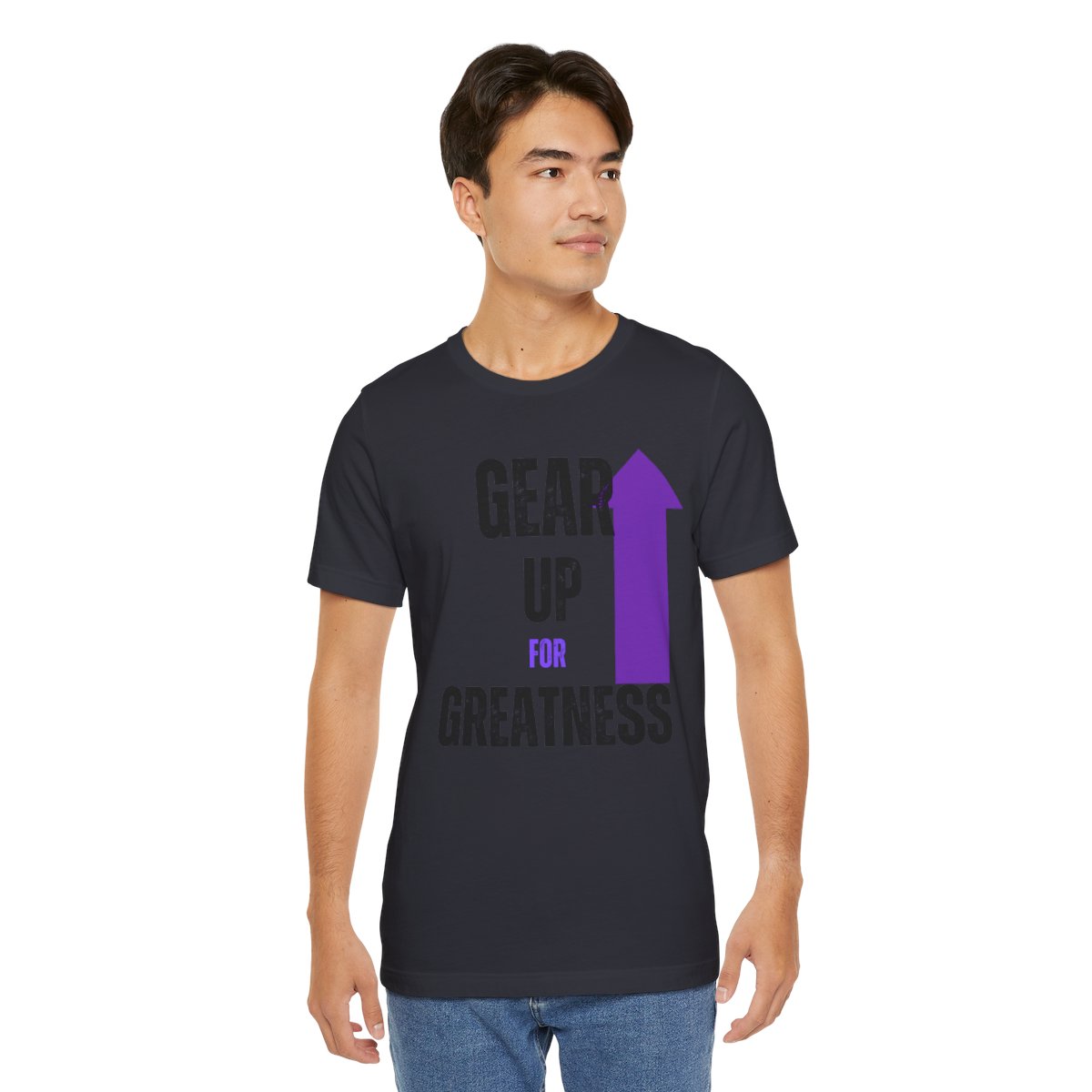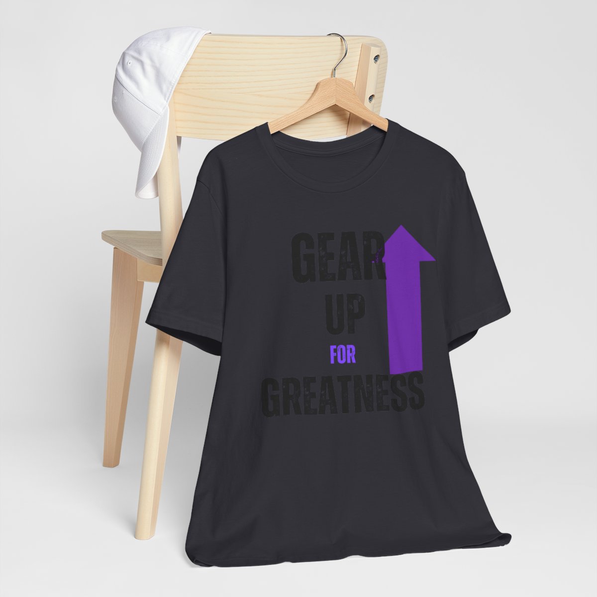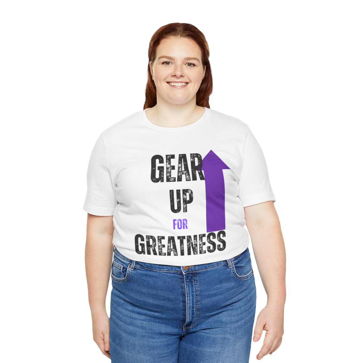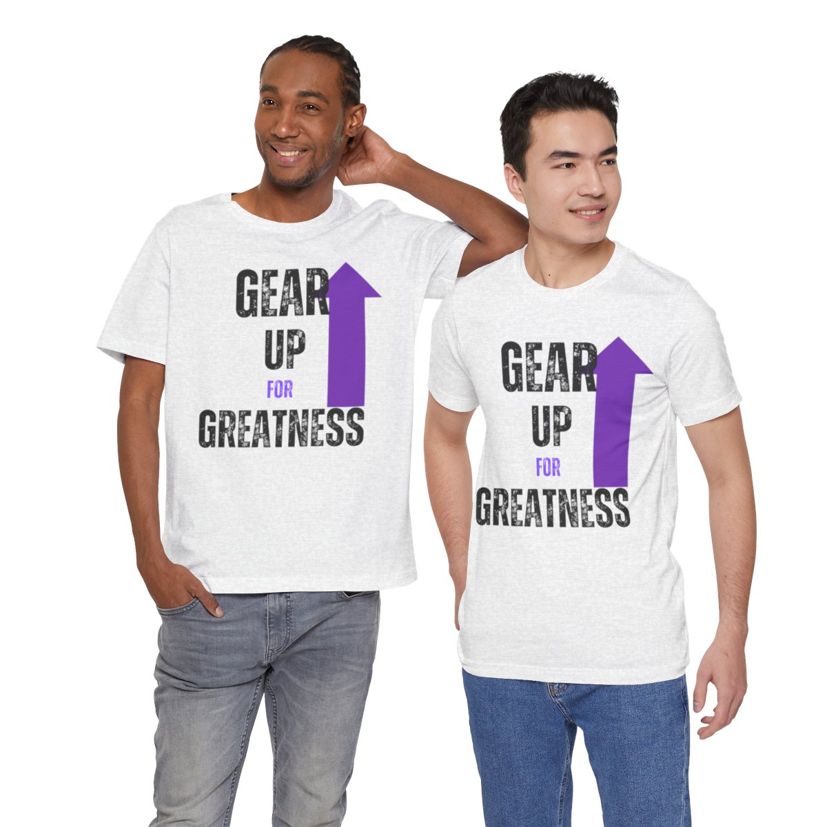 Design: The text is arranged in a stacked formation, with “GEAR UP” on the top line and “FOR GREATNESS” beneath it. The font is modern and easily readable, while a slight distressed texture adds character.