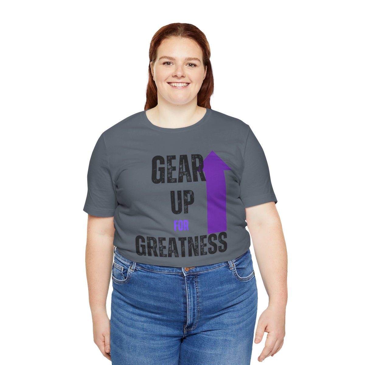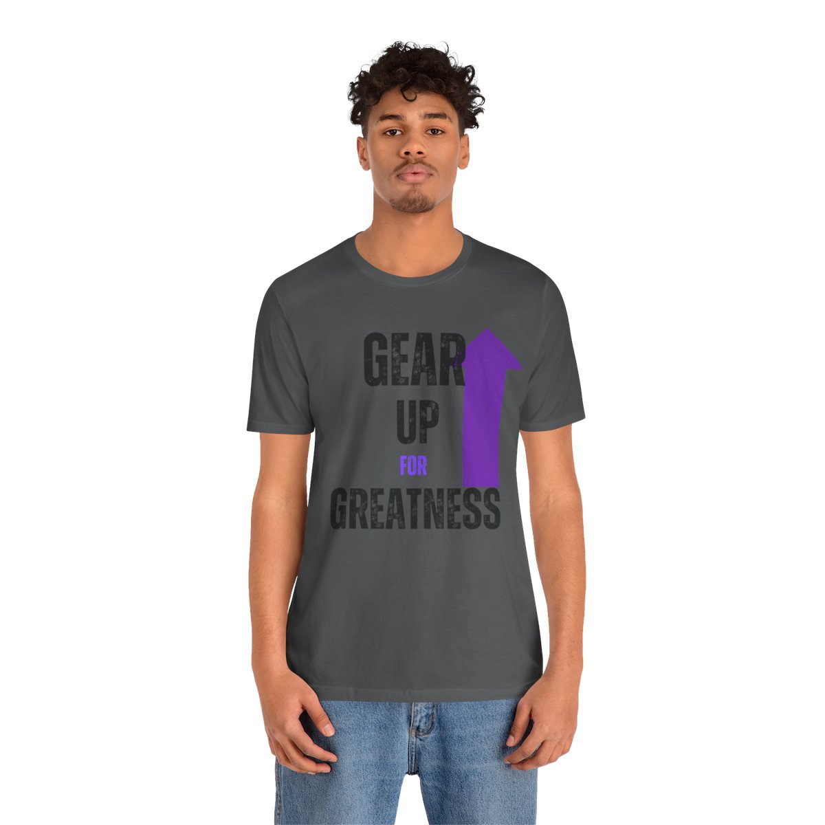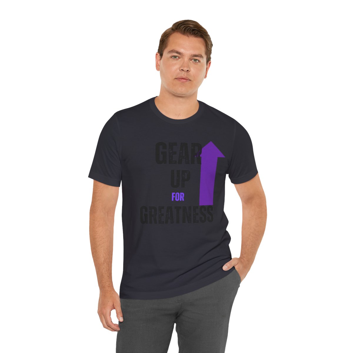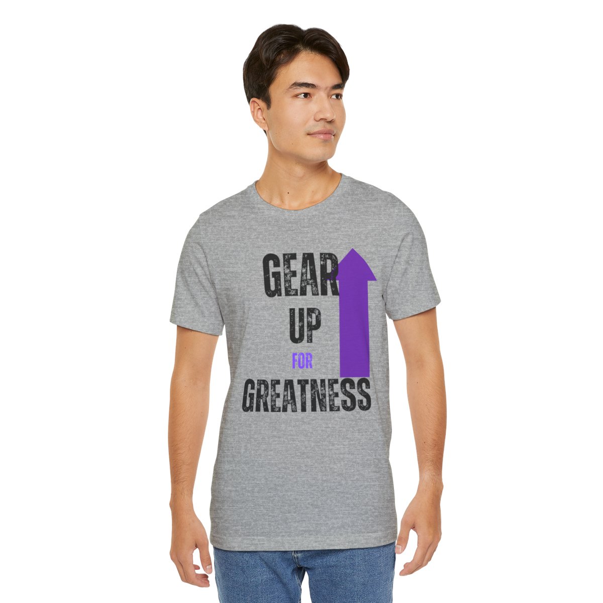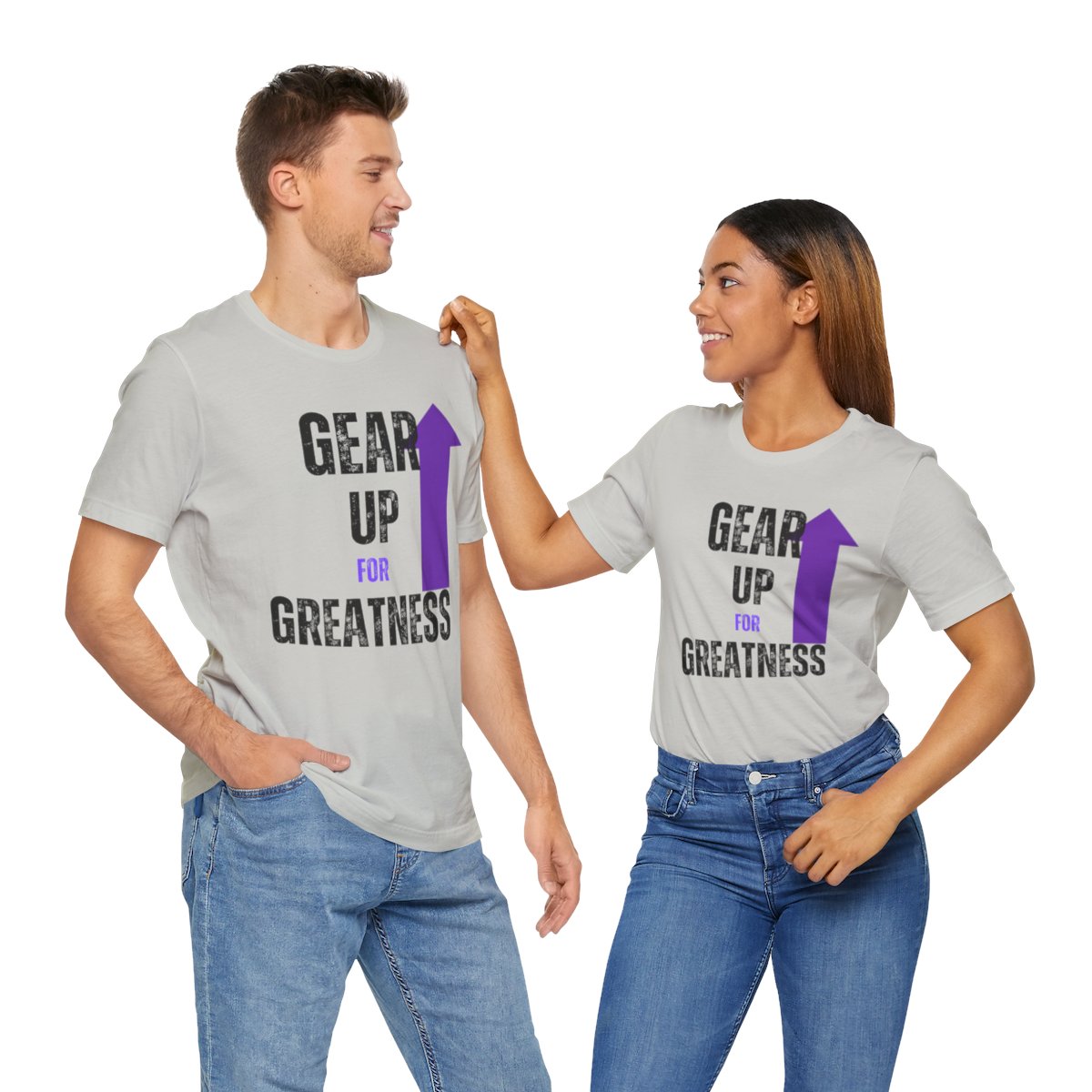 Design: The text is arranged in a stacked formation, with “GEAR UP” on the top line and “FOR GREATNESS” beneath it. The font is modern and easily readable, while a slight distressed texture adds character.