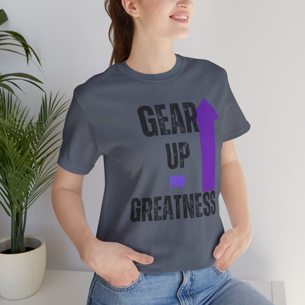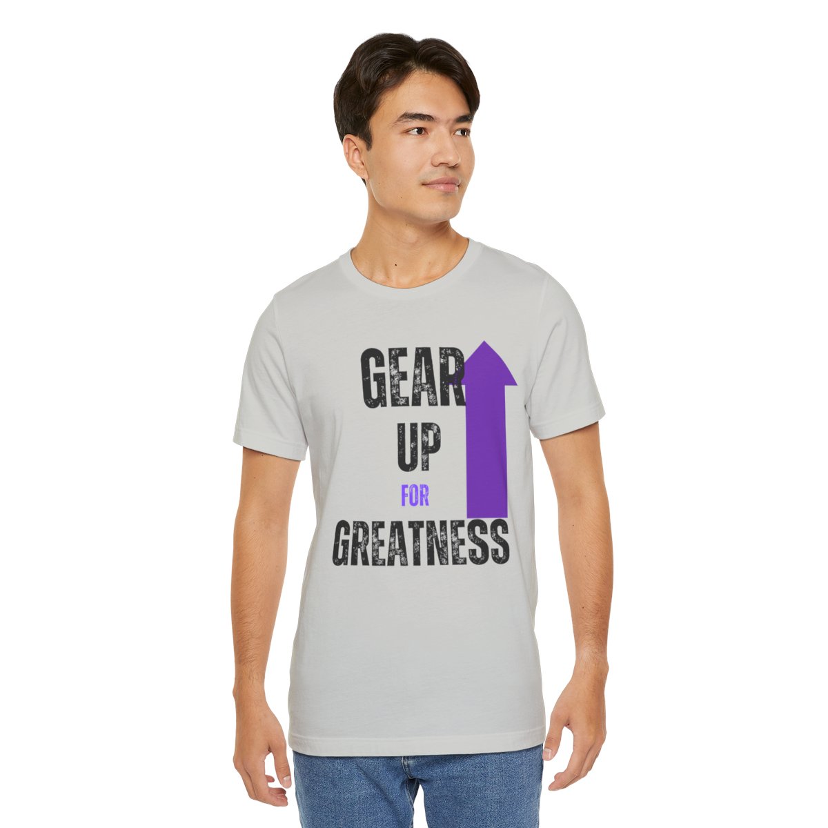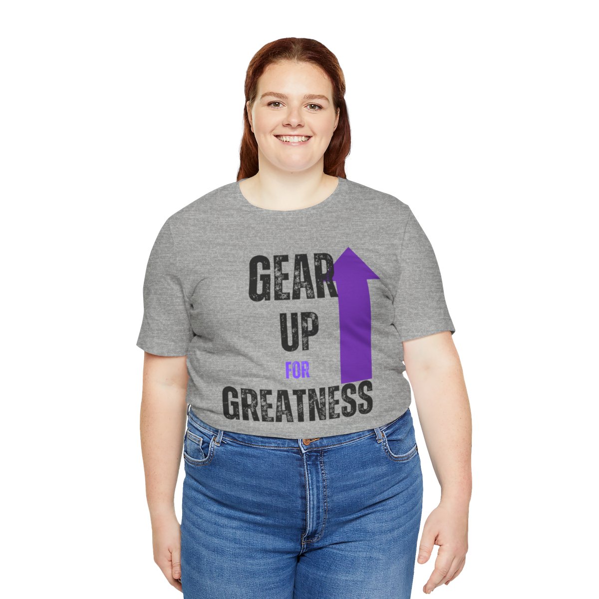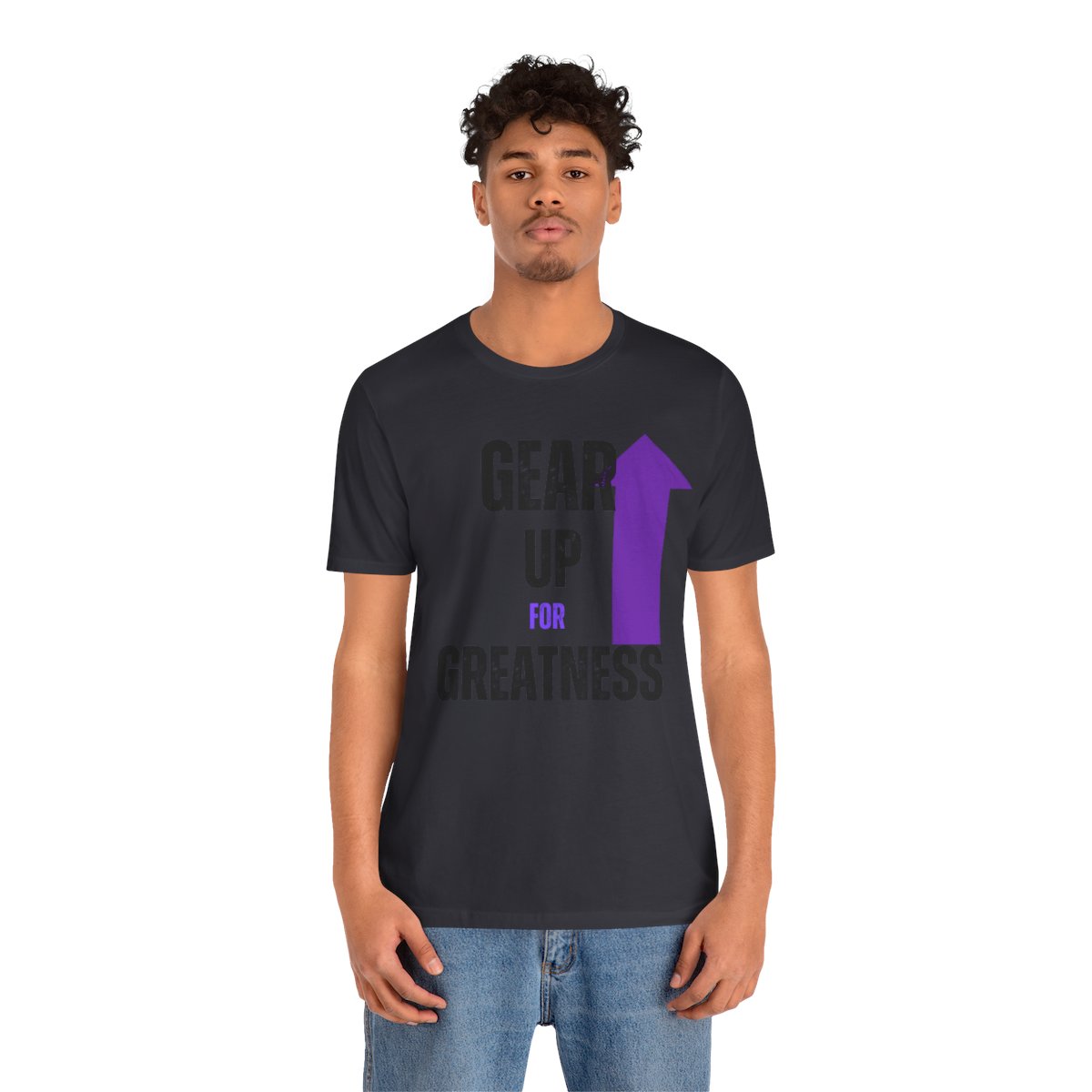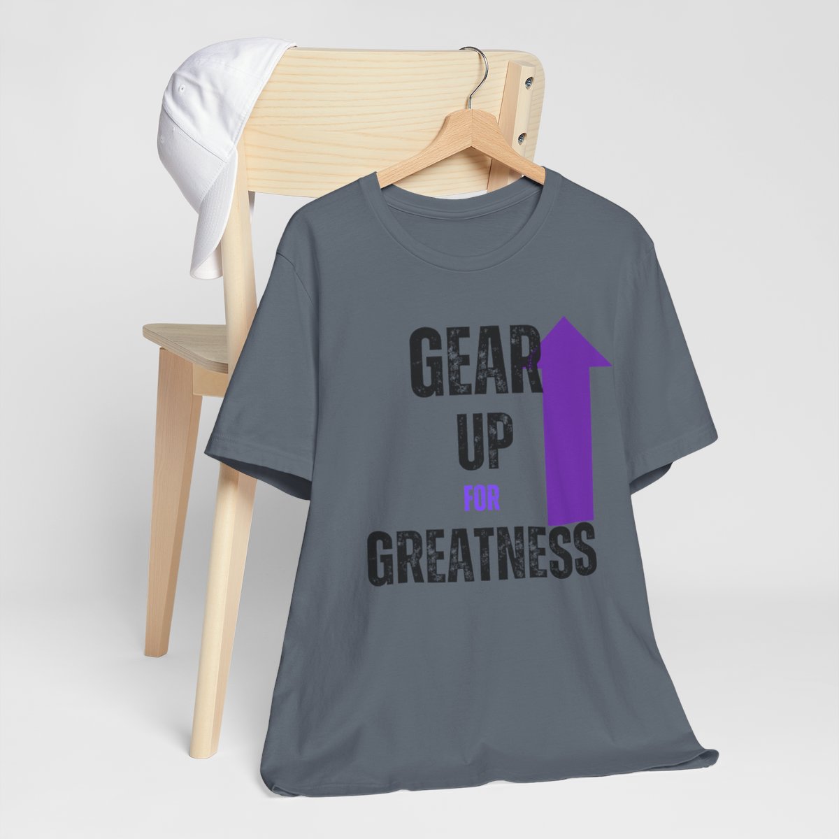 Design: The text is arranged in a stacked formation, with “GEAR UP” on the top line and “FOR GREATNESS” beneath it. The font is modern and easily readable, while a slight distressed texture adds character.