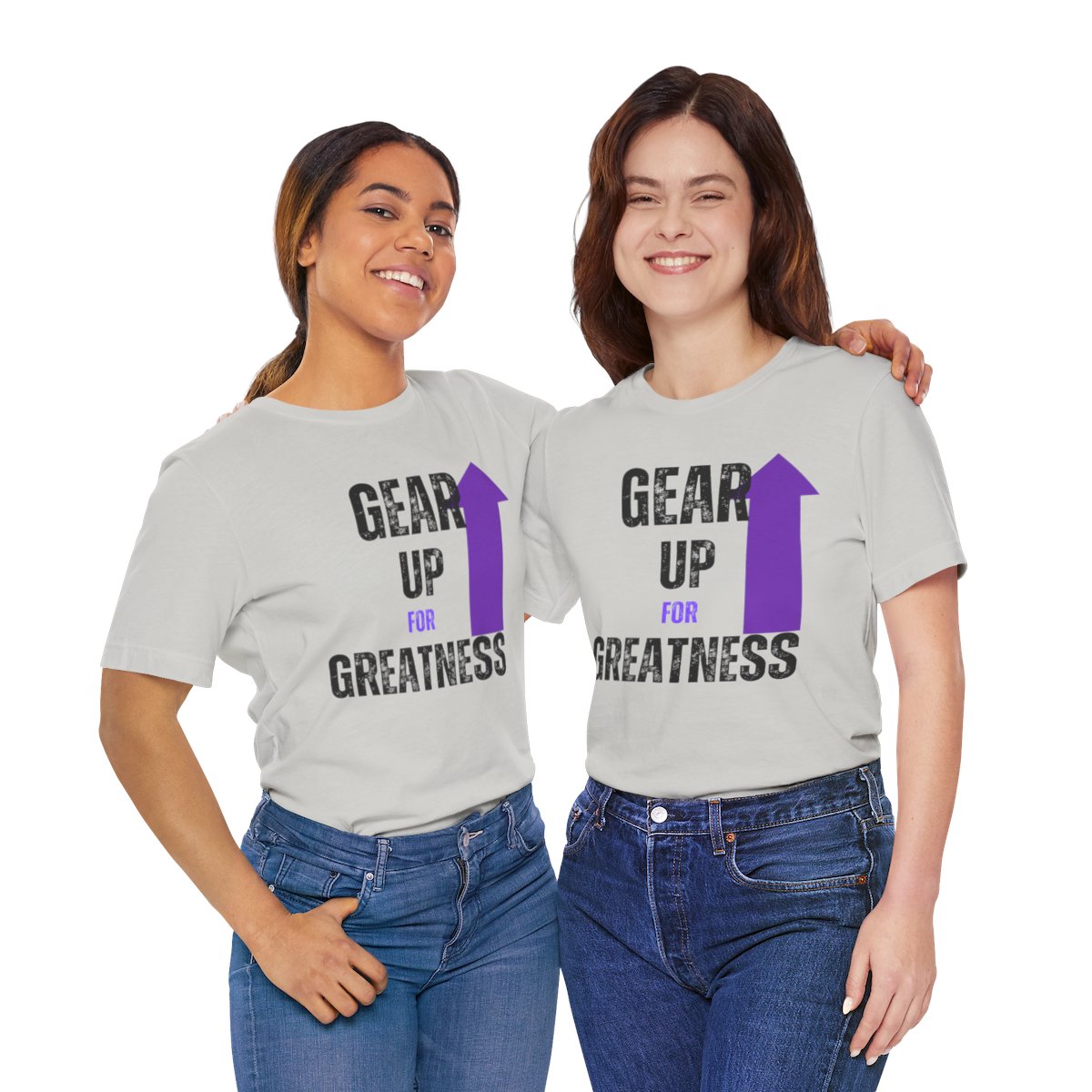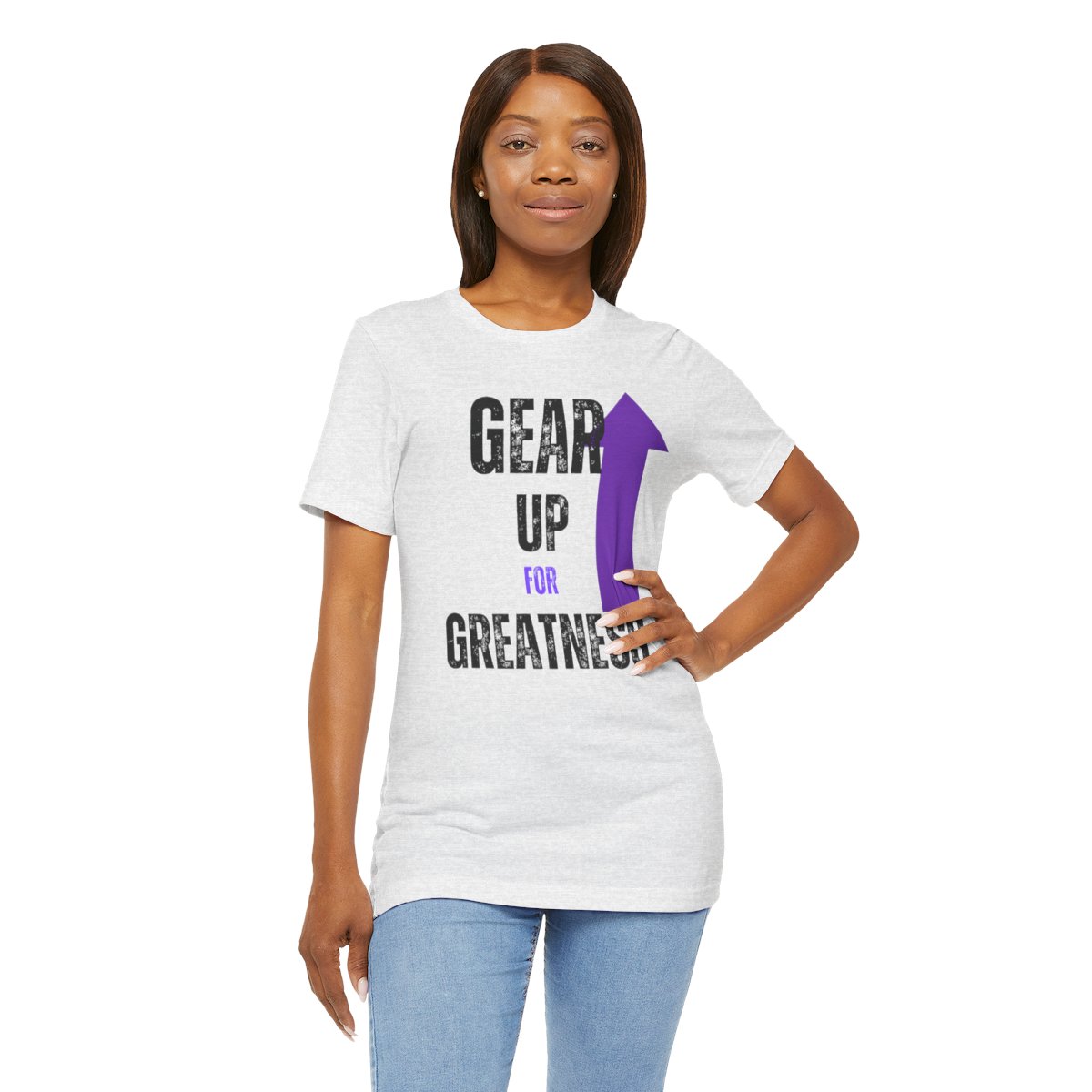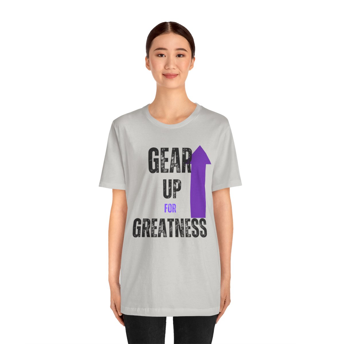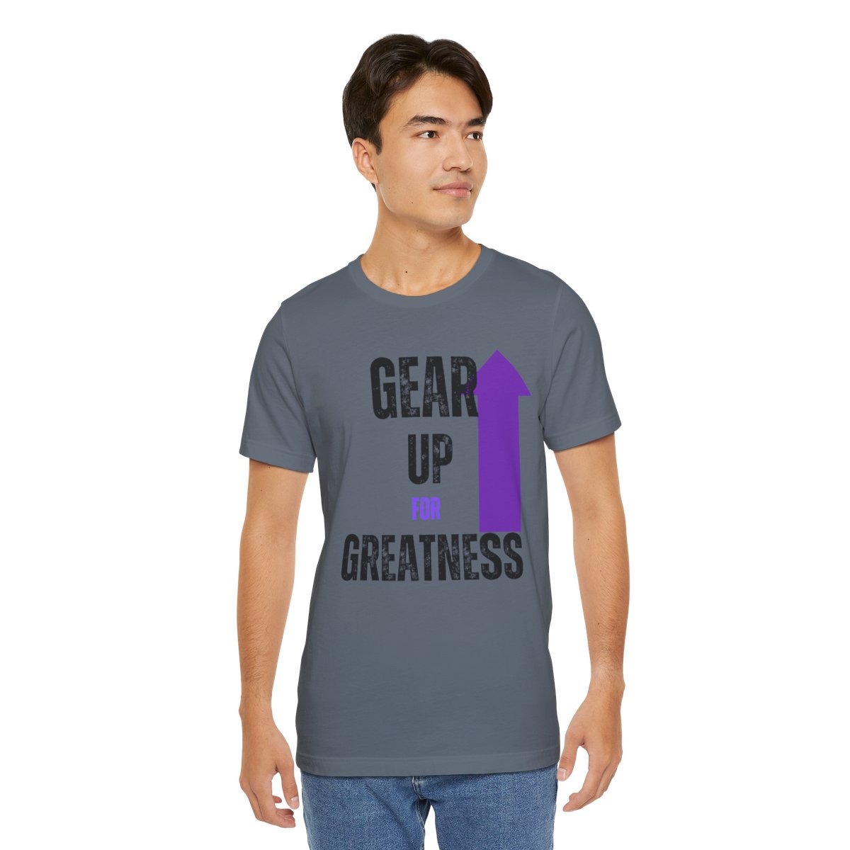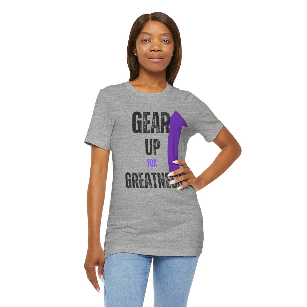 Design: The text is arranged in a stacked formation, with “GEAR UP” on the top line and “FOR GREATNESS” beneath it. The font is modern and easily readable, while a slight distressed texture adds character.
