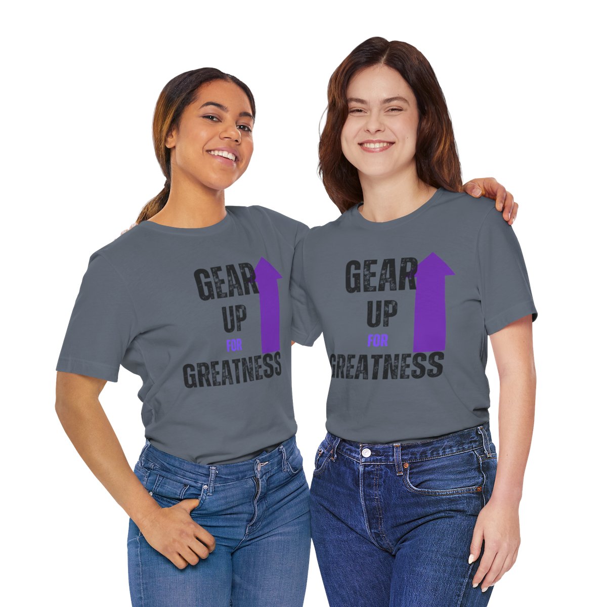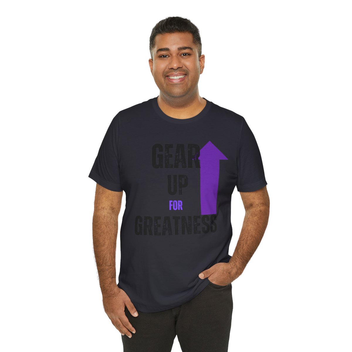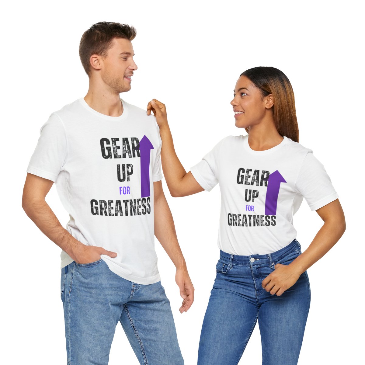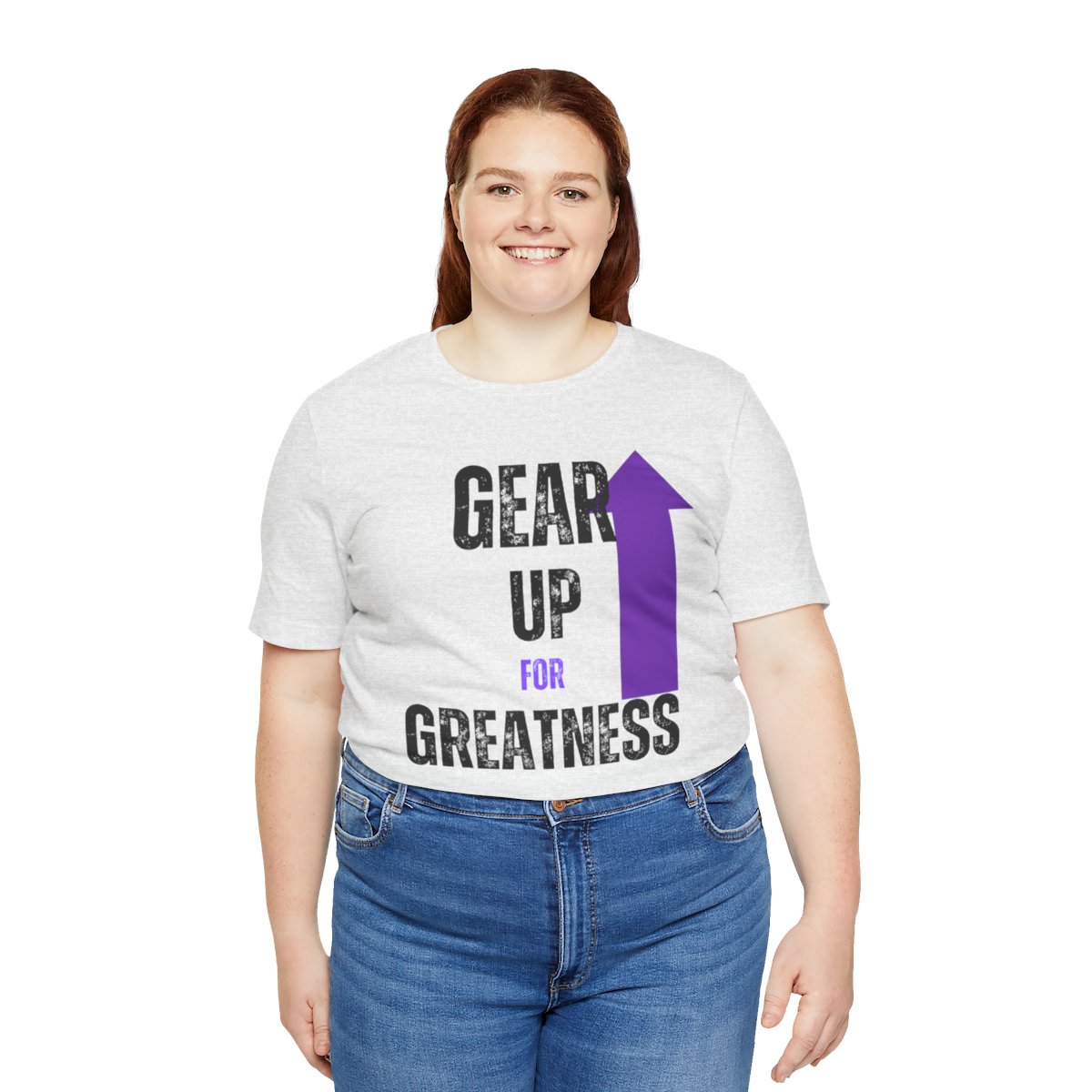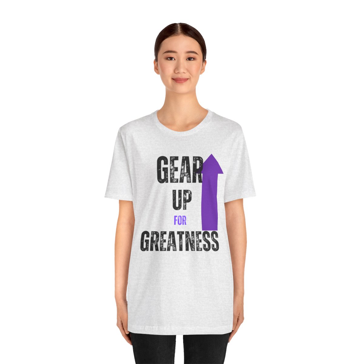 Design: The text is arranged in a stacked formation, with “GEAR UP” on the top line and “FOR GREATNESS” beneath it. The font is modern and easily readable, while a slight distressed texture adds character.