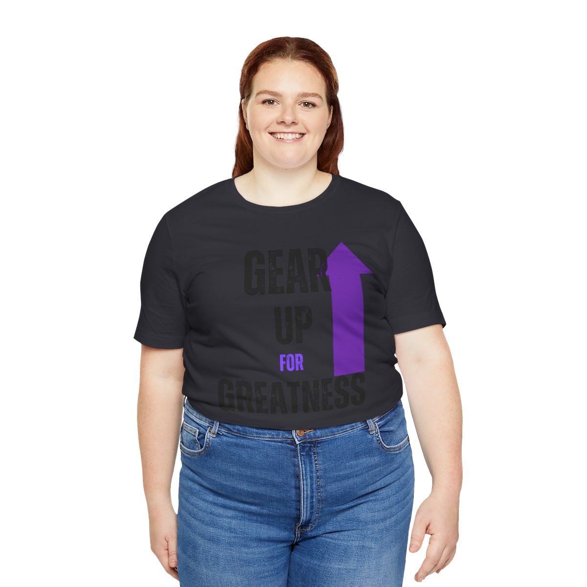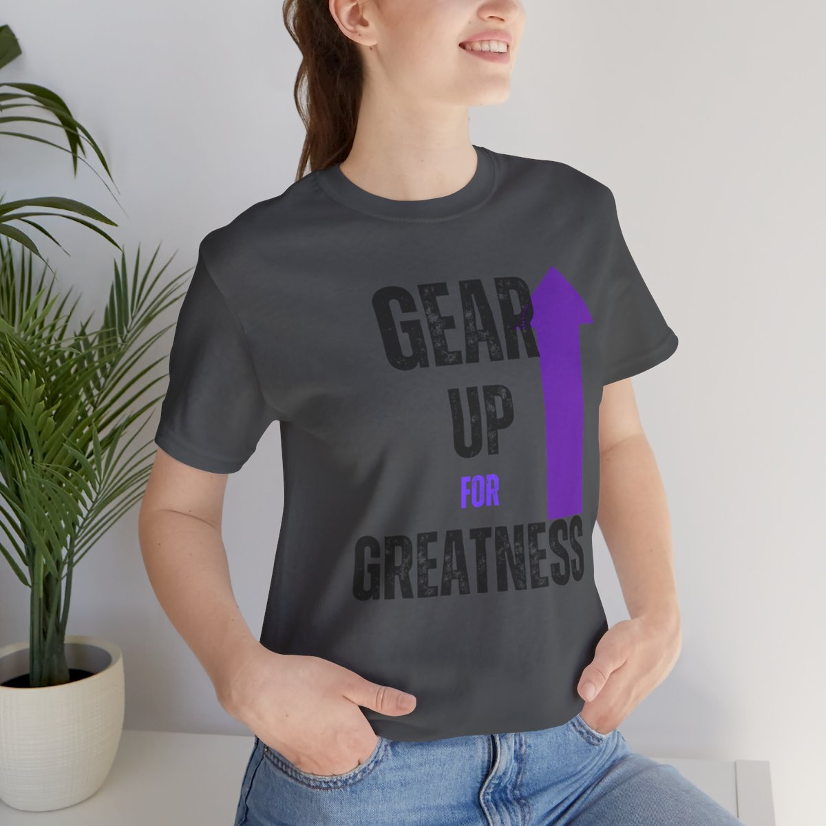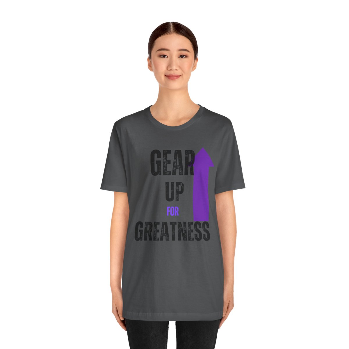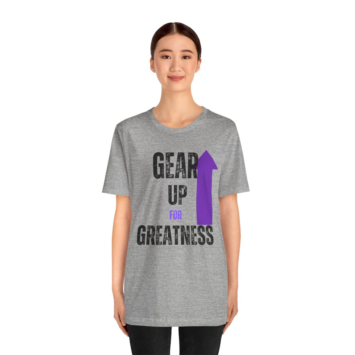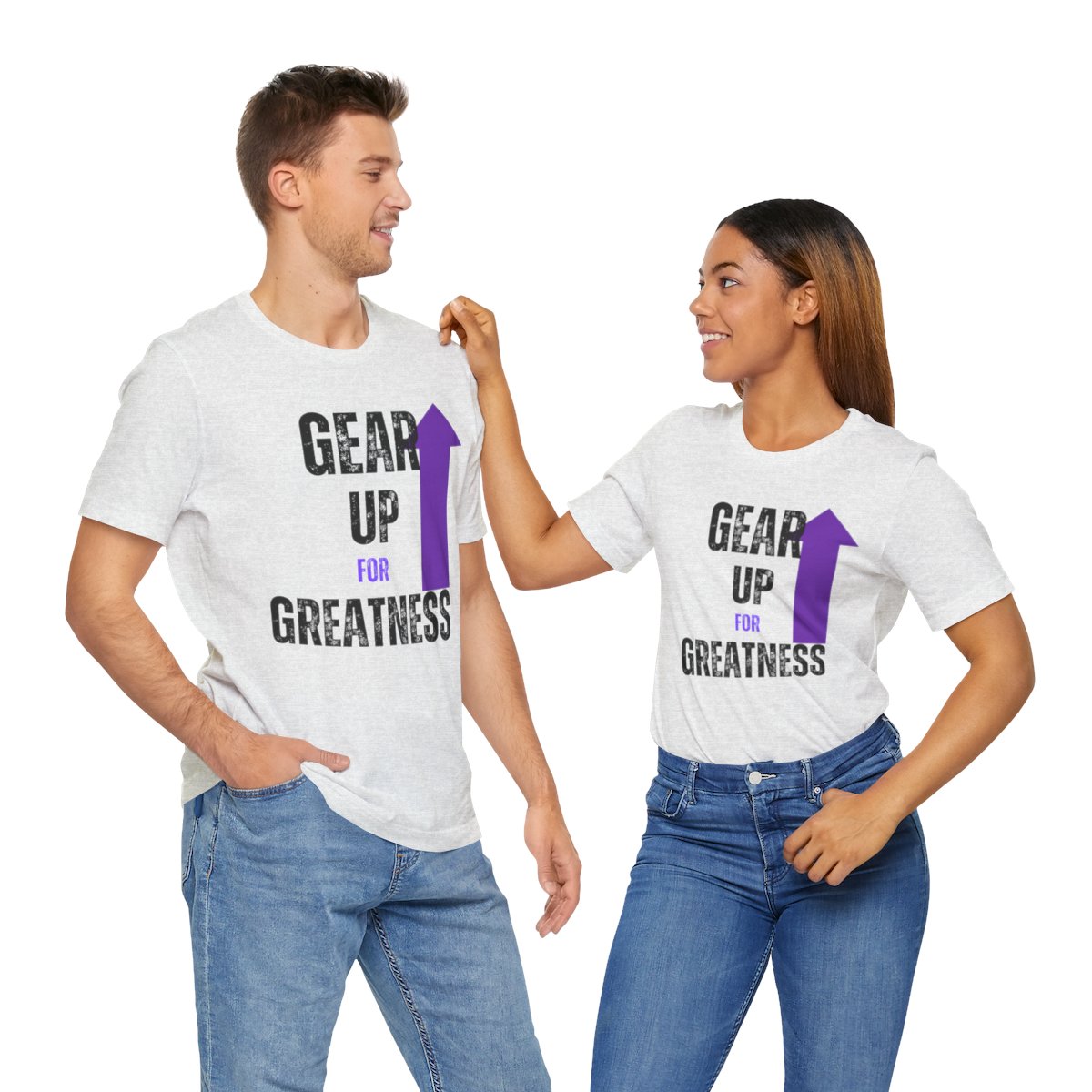 Design: The text is arranged in a stacked formation, with “GEAR UP” on the top line and “FOR GREATNESS” beneath it. The font is modern and easily readable, while a slight distressed texture adds character.