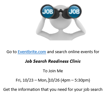 Remember to visit Eventbrite.com and search for Job Search Readiness Clinic. Then join me this Friday through Monday afternoons (Oct 23 – 26) to get valuable information on how to start your job search successfully.